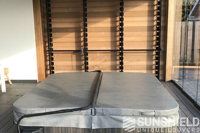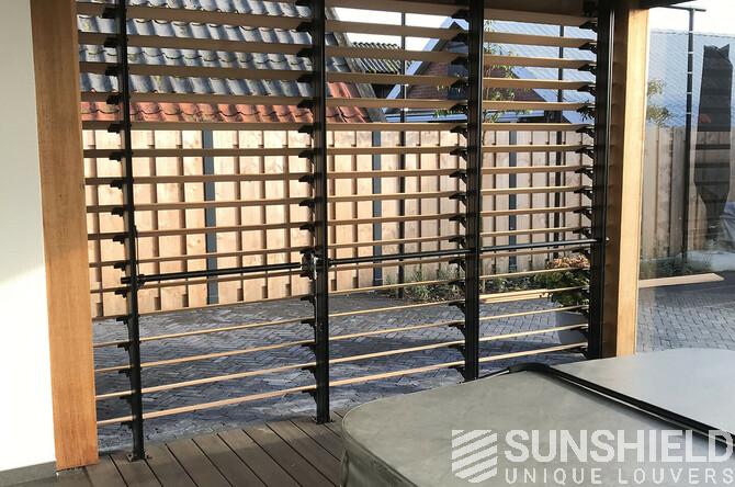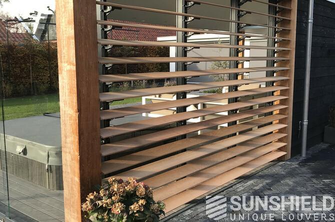 Here is a canopy equipped with a slatted wall. By Sunshield. Thanks to this louvered wall, the residents can actually decide for themselves whether to stay inside or outside under the roof.