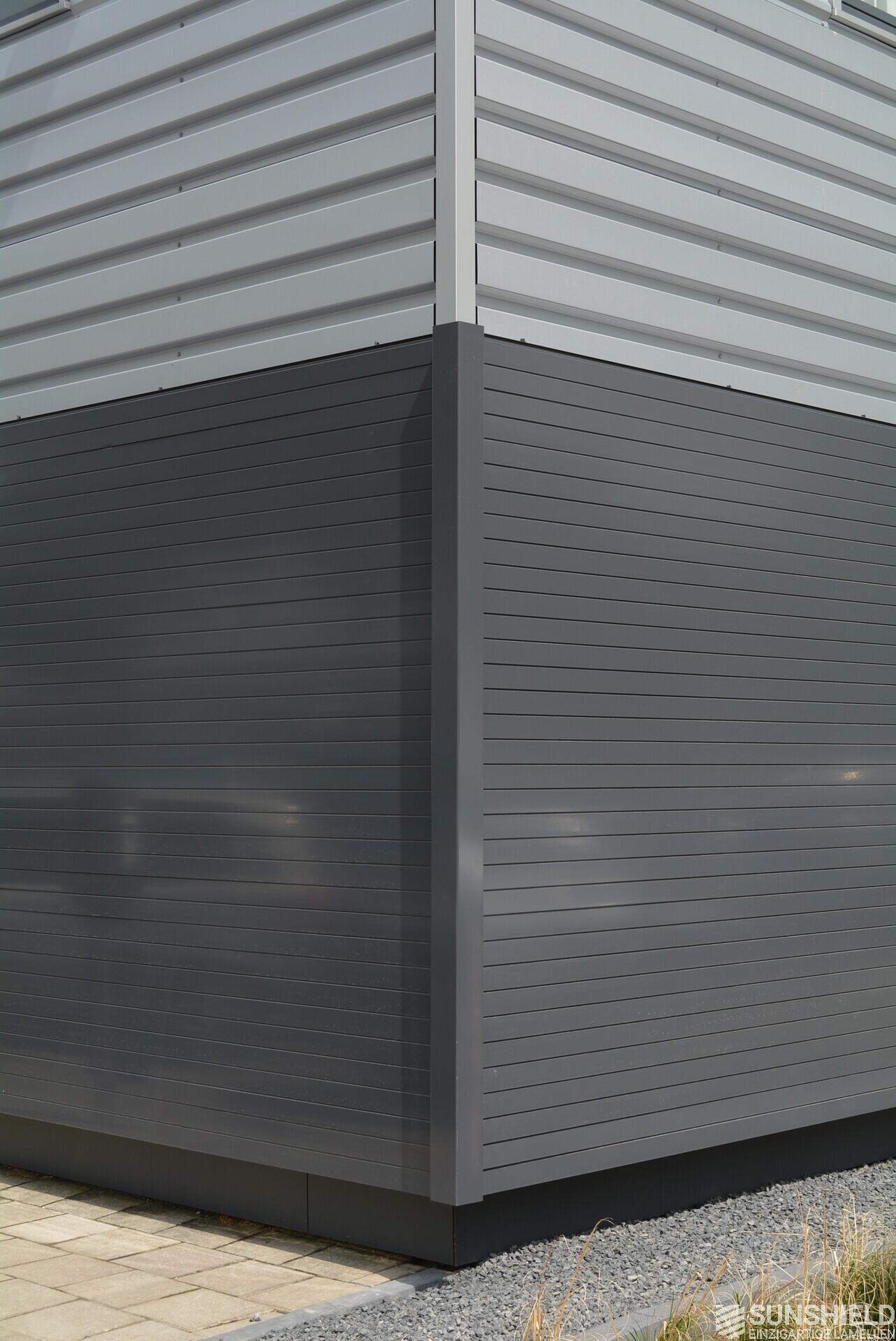 The aluminium components such as the slats and supports are coated in RAL 7024, graphite gray. The plastic parts are black.