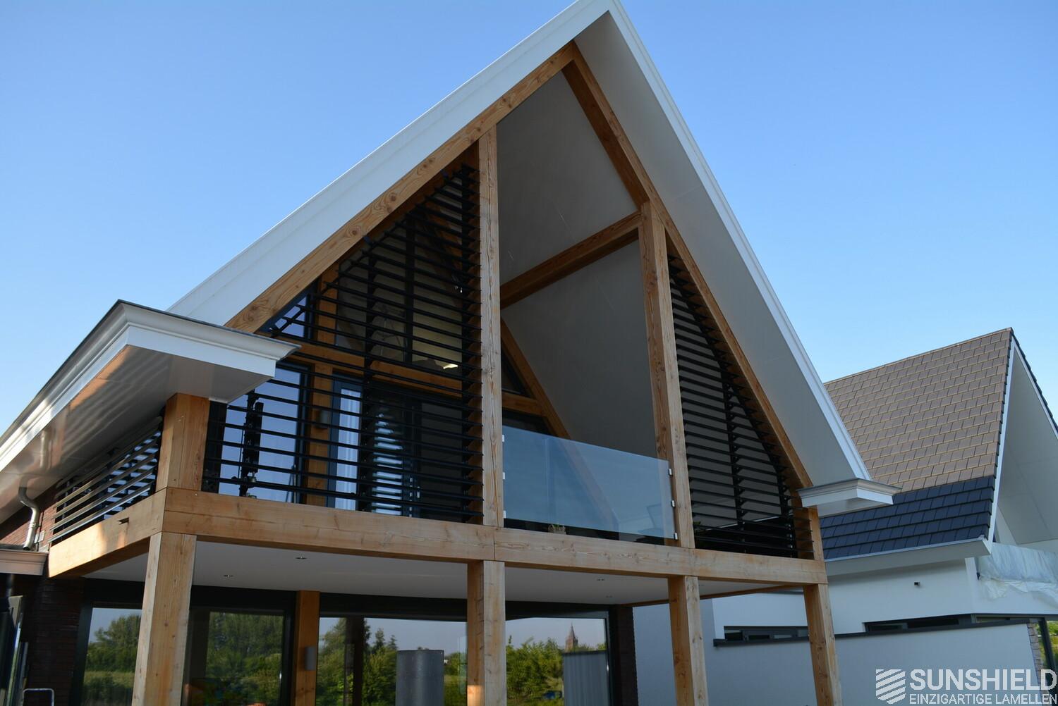 Here, in this region that is as green as it is water-rich, a detached house has been fitted with unique louvers. By Sunshield. A veranda has been created with slats, under the spacious overhang on the first floor.