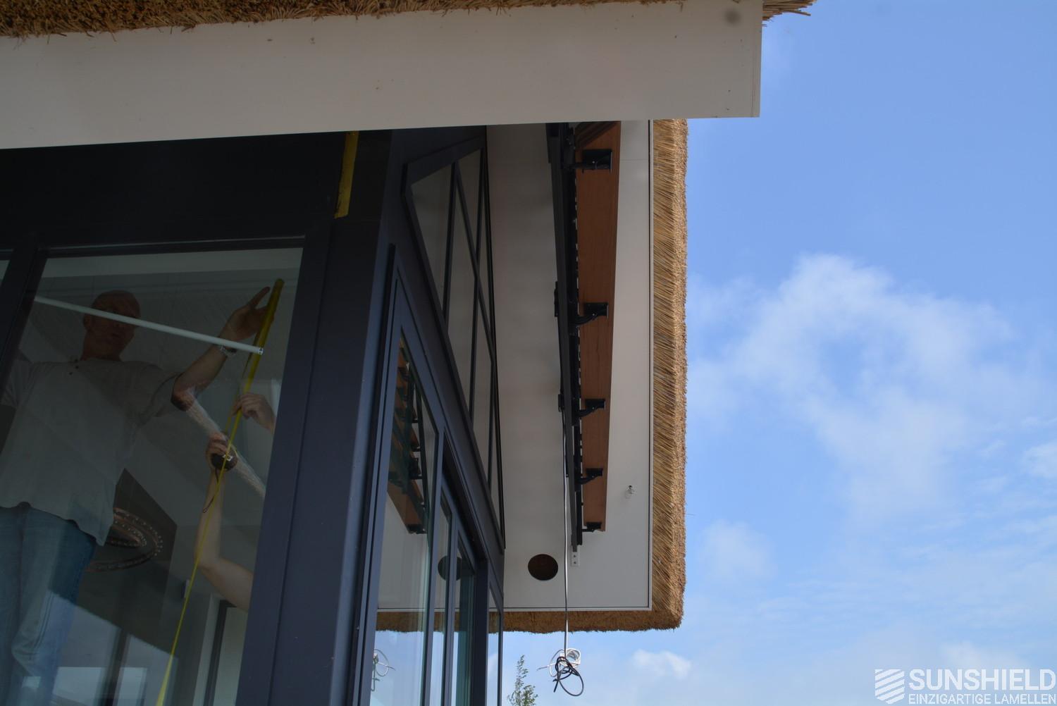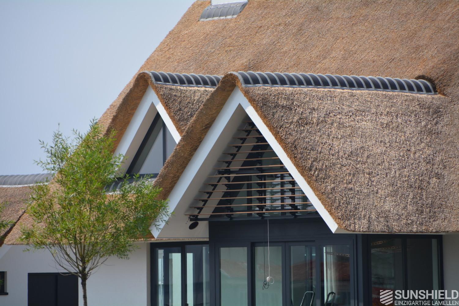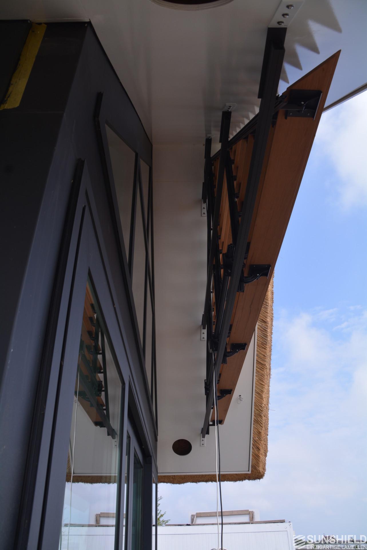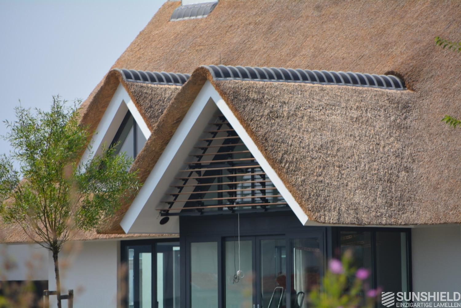 The triangular louver system has an area of a little over 3 m2. The louvers are opened and closed using a remote control. Or placed in any desired position in between, that is stepless.