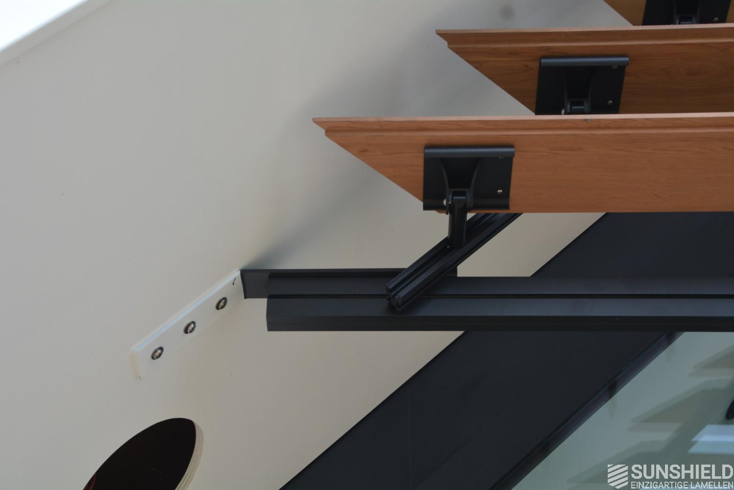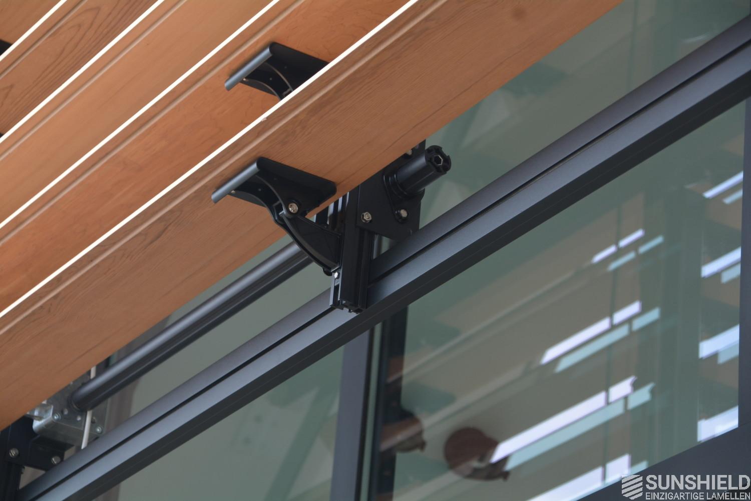Western Red Cedar was used for the louver. Wood with a straight grain, lightweight, stable and durable. The aluminum components are coated in RAL 7021 – black-grey. The plastic parts are in black.