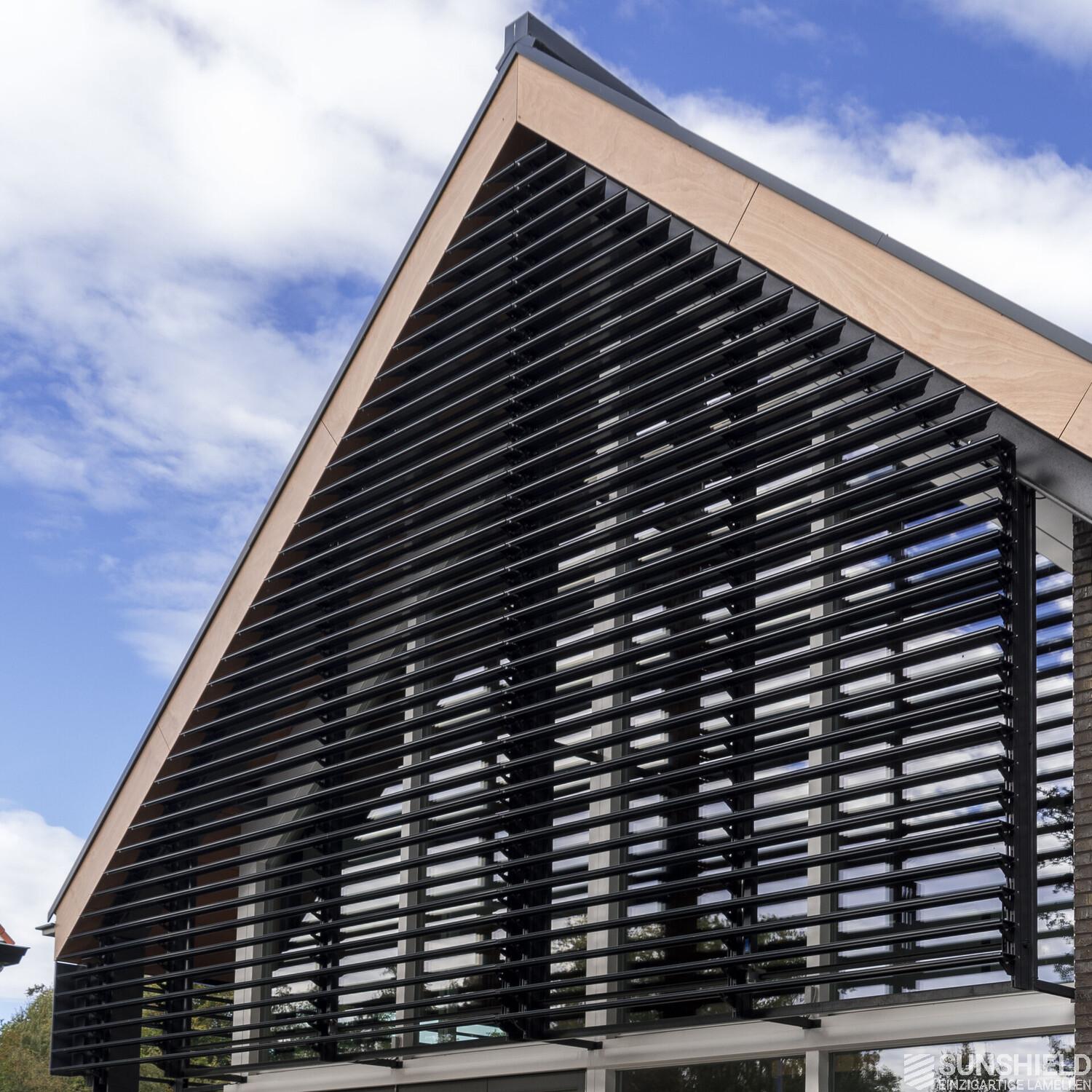 What makes this project even more unique than usual is that the louver systems are not mounted directly on the building, but on trusses. As a result, the sun protection is slightly removed from the wall.