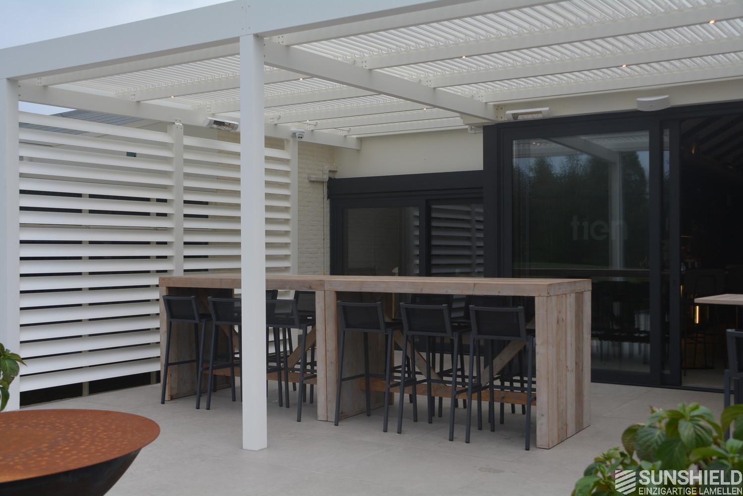 The Infinity pergola of the Golfclub Overbrug has been executed in RAL 9010 – white. The clips, conntecting the louvers to the rack arms, are white too.