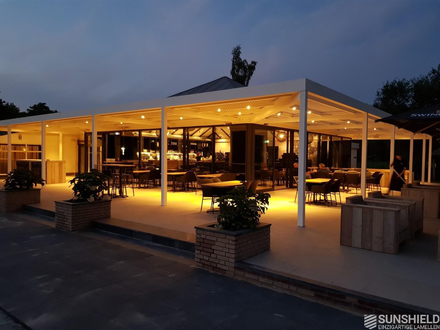 At the Golfclub Overbrug in Helmond, the south and west sides of the renovated clubhouse, have been extended with a beautiful Infinity louver roof with 160 m2 of movable louvers (slats).