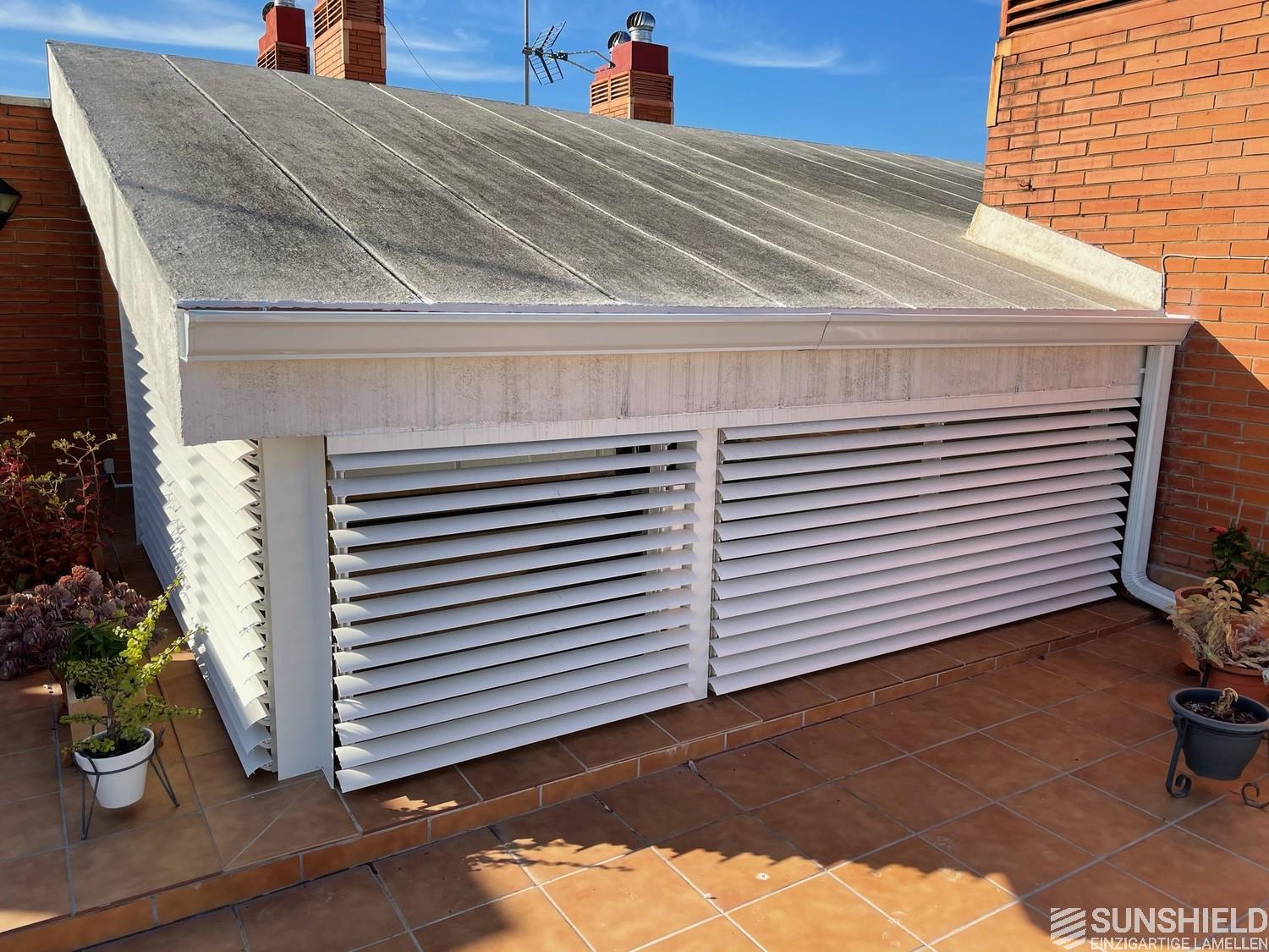 For maximum flexibility the client opted for two rectangles instead of just one in front of the veranda. A third, trapezium shaped, louver system is installed at the side. Each blind is operated by its own motor.