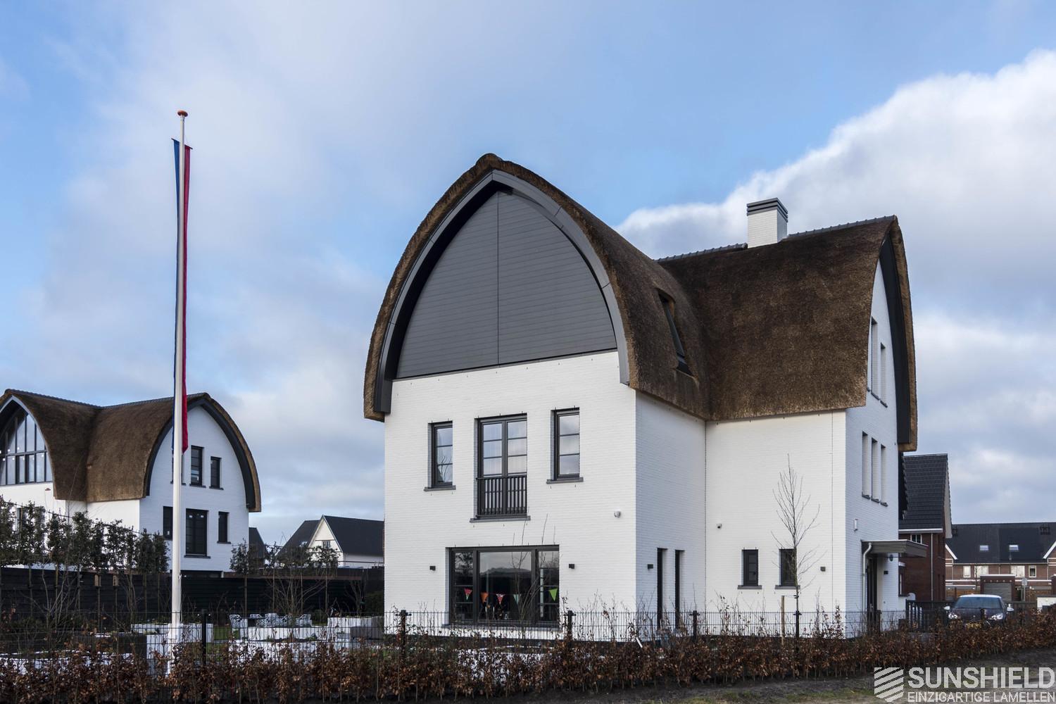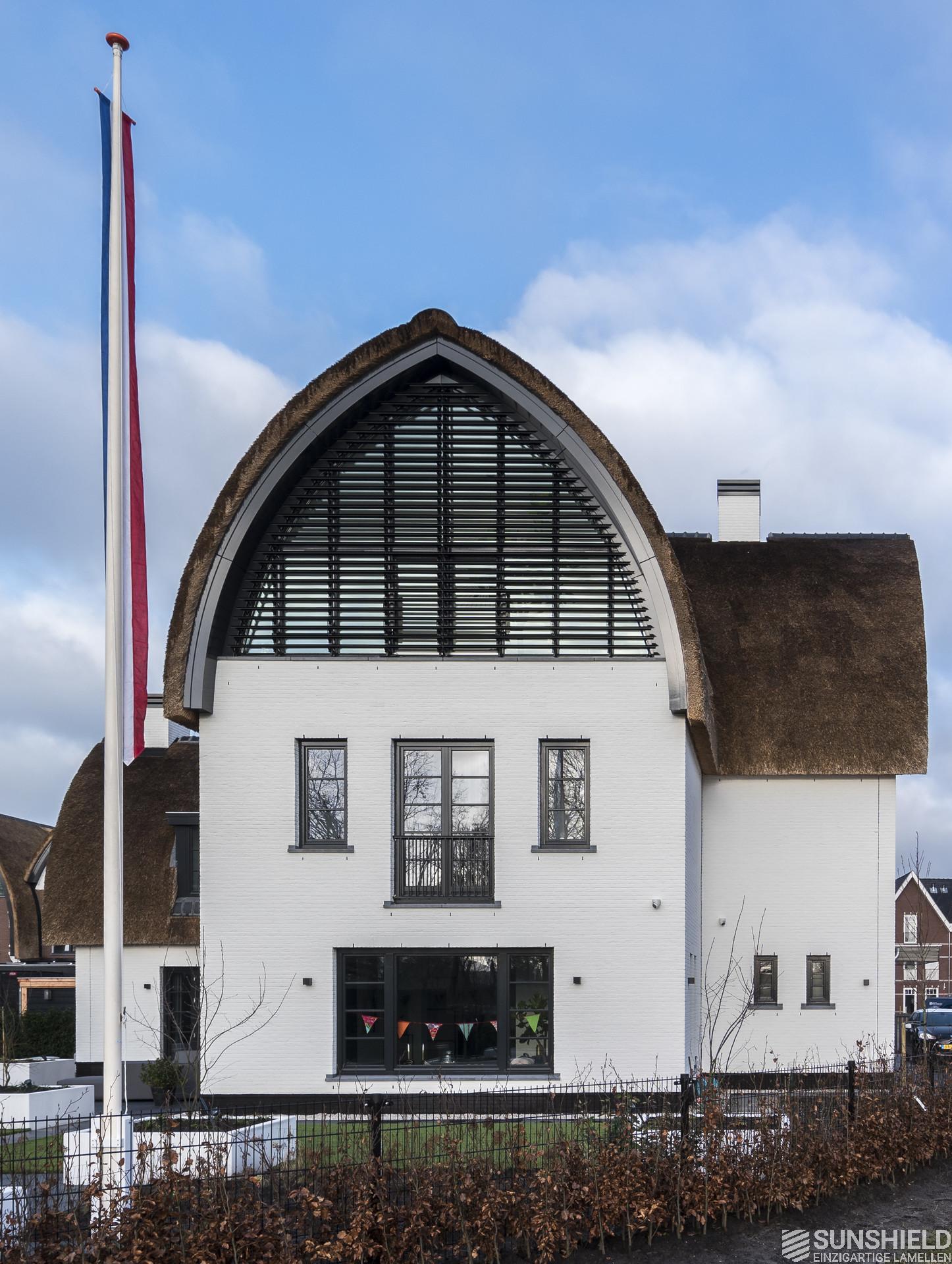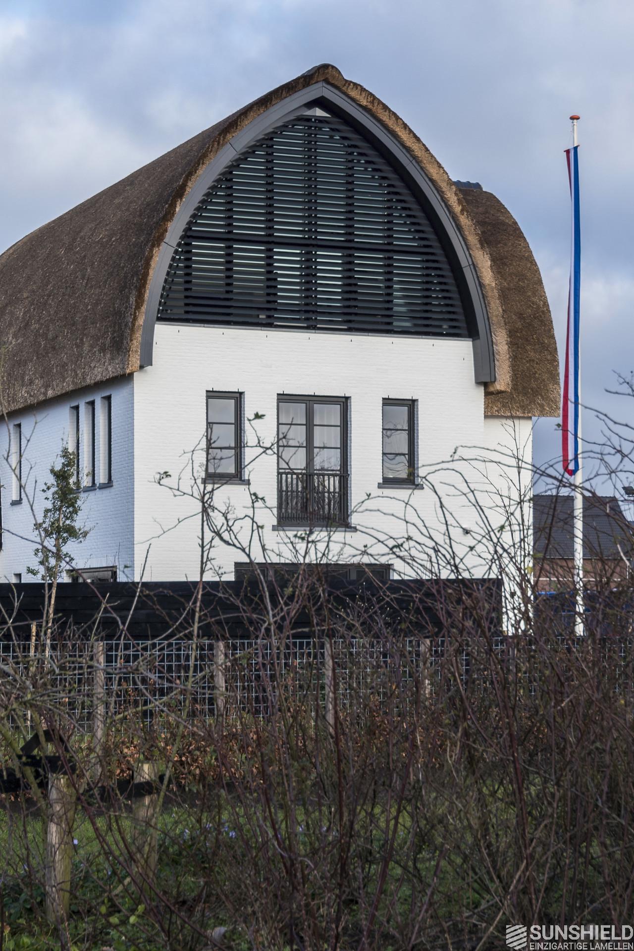 The homeowners opted for the 150-E louver for this sun protection. The aluminium parts are coated in RAL 7021 (black gray) with a gloss level of 30%. The jet moulded plastic parts are black.