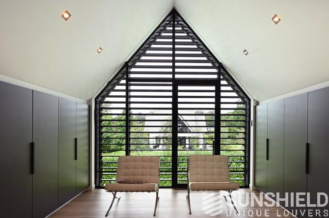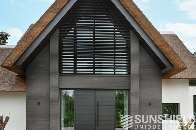 Two blade systems have been installed on the rear facade. A rectangle/triangle has been installed above the sliding doors and a triangular louver system on the gable next to it.