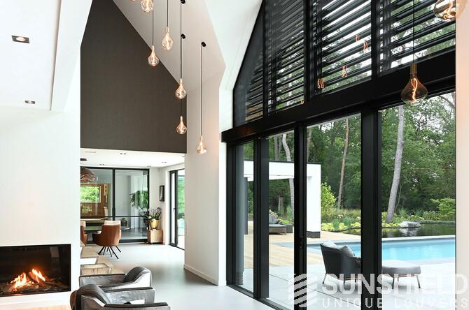 Here is a modern villa equipped with unique louvers. By Sunshield, commissioned by Habé Bouwen in Stijl in Lunteren. The beautiful country house was designed by architect Paul Tesser.