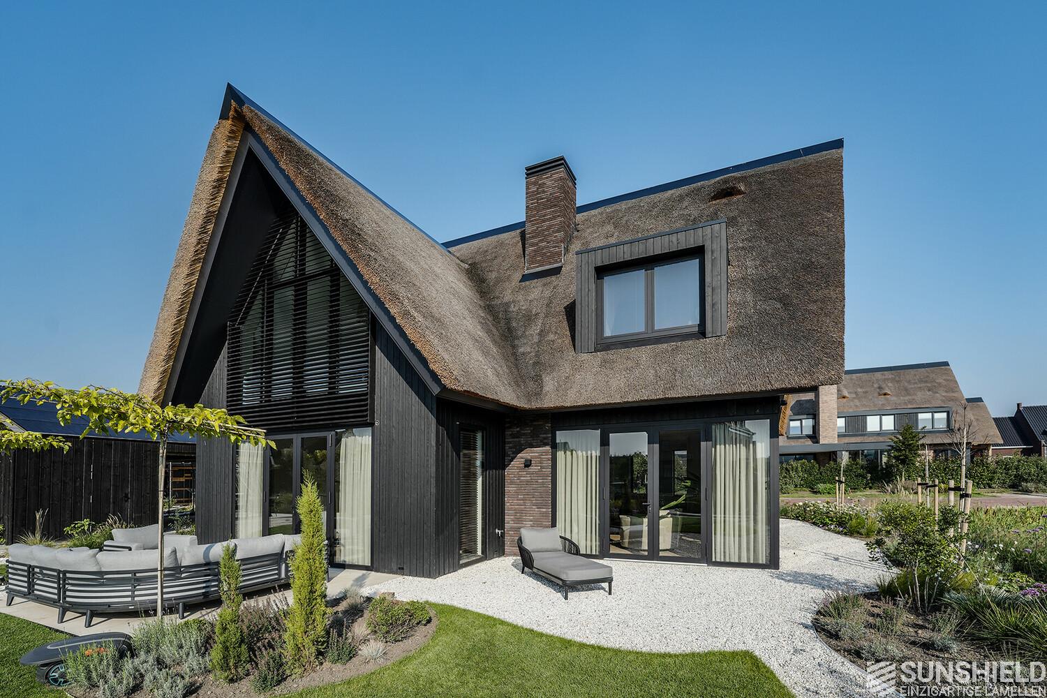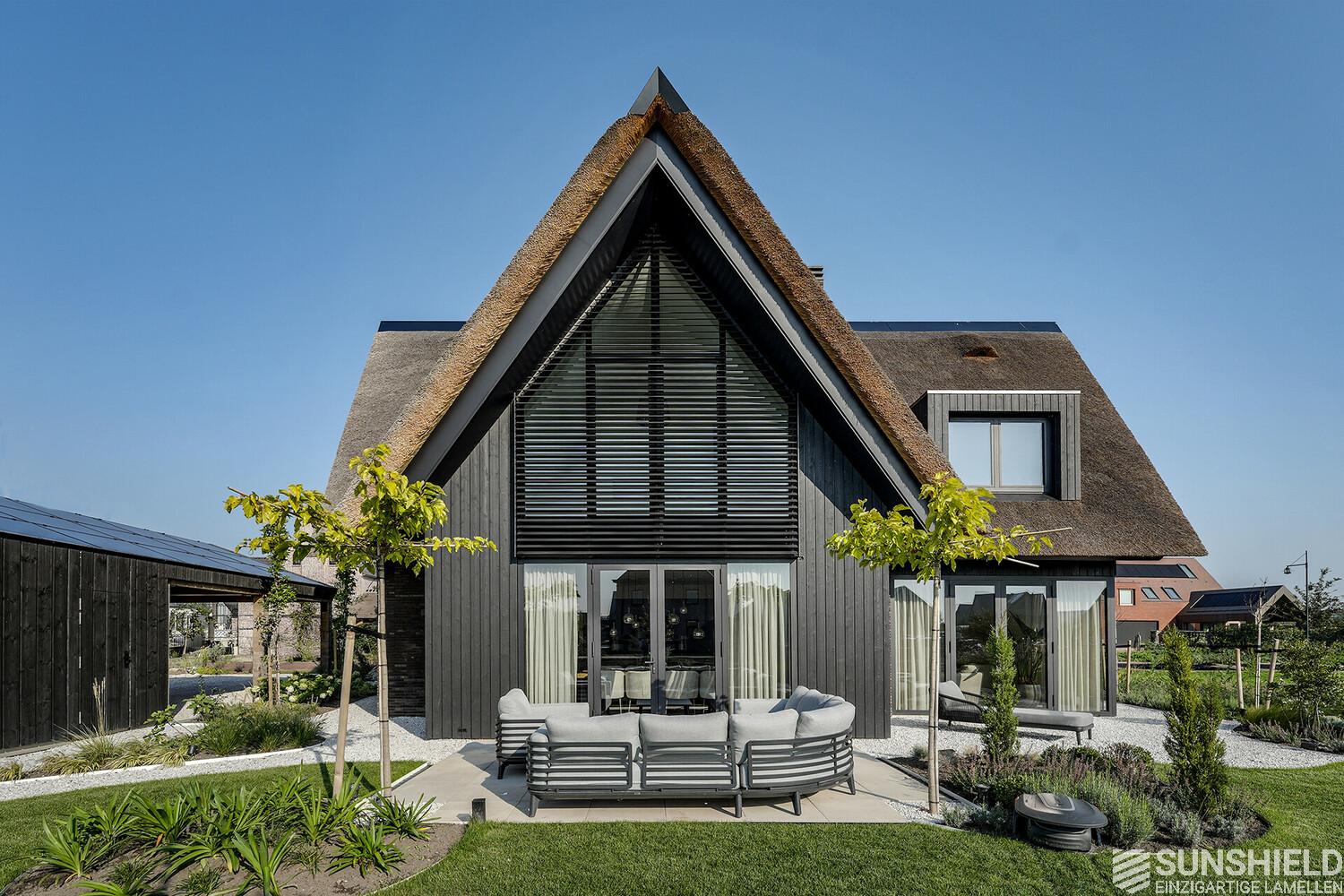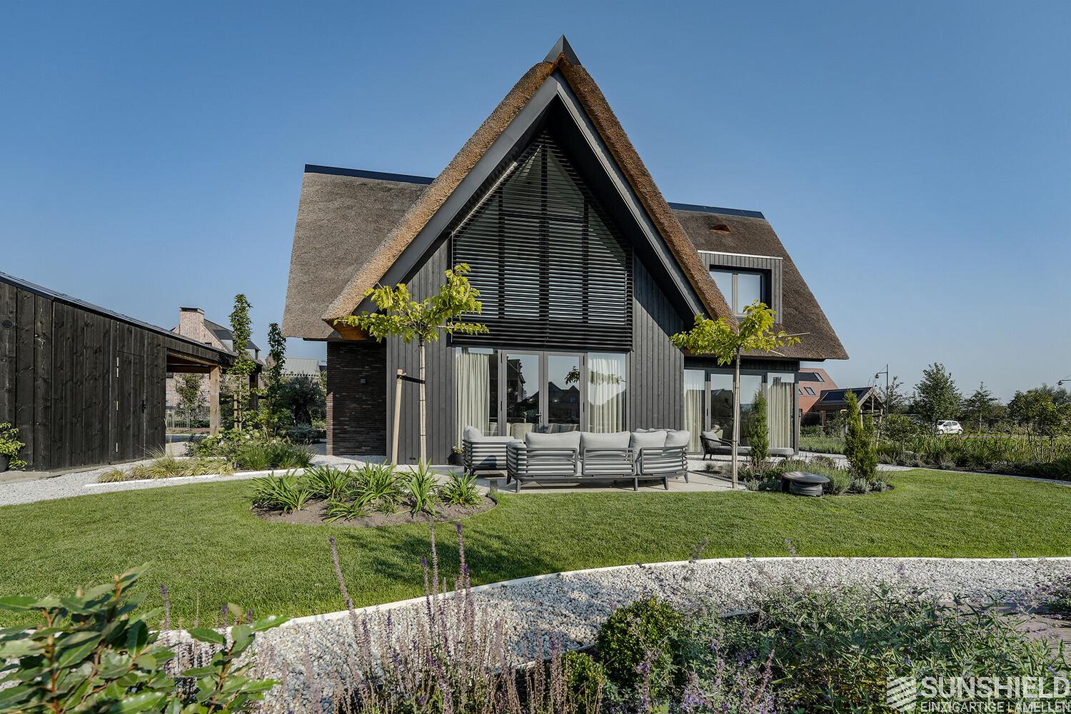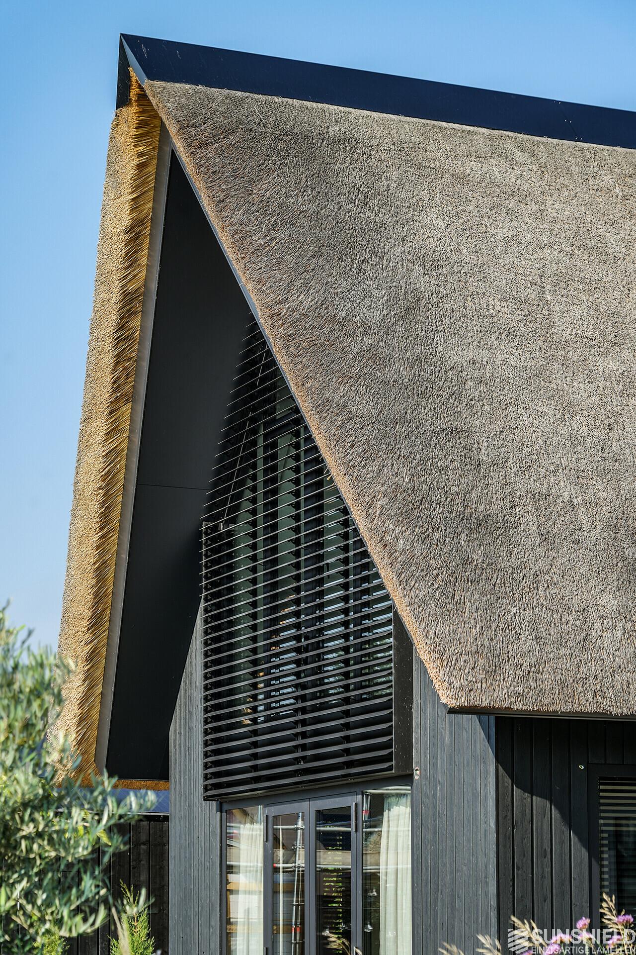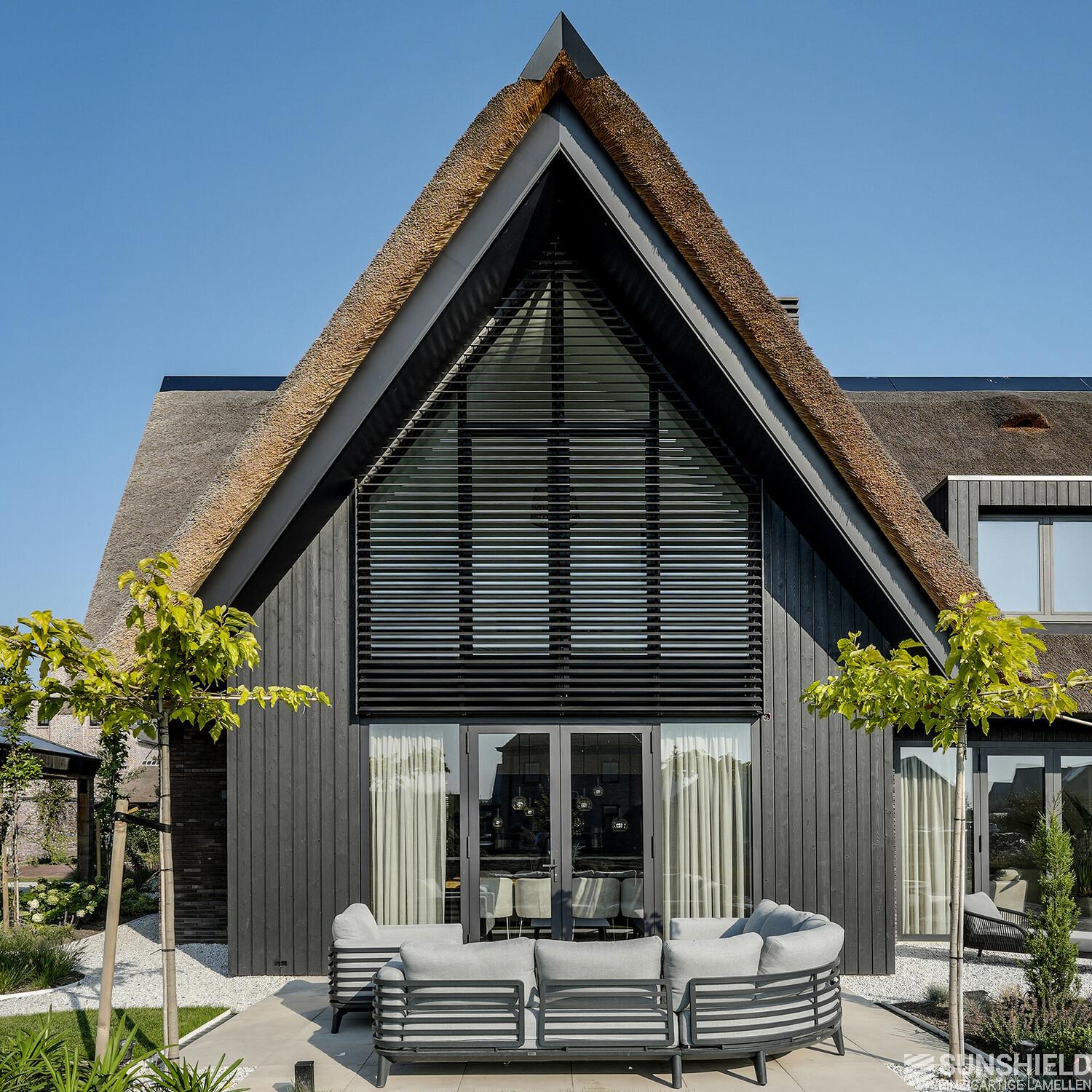 Here, a villa is fitted with unique louvers, by Sunshield. This elegant residence was built to a design by Bongers Architects, who included the louvers in the specifications.