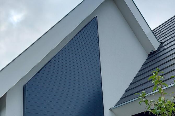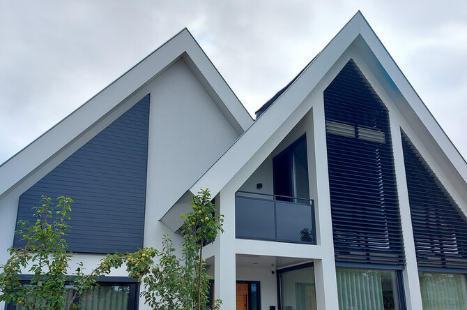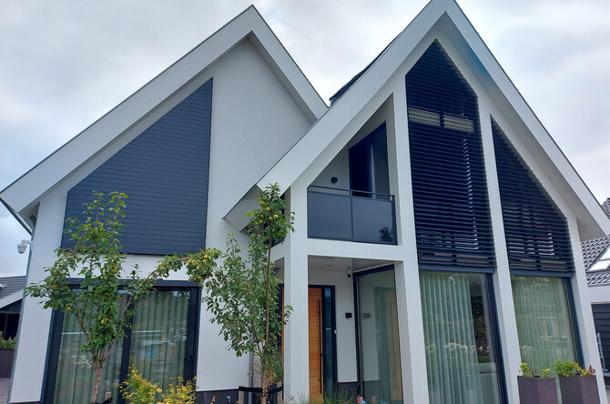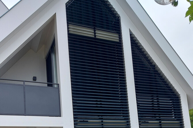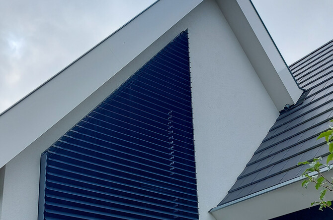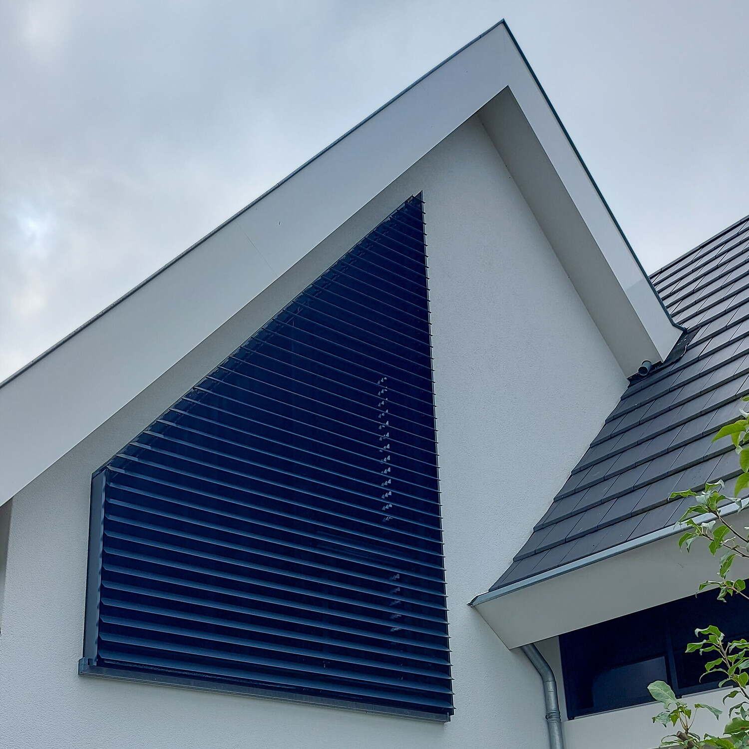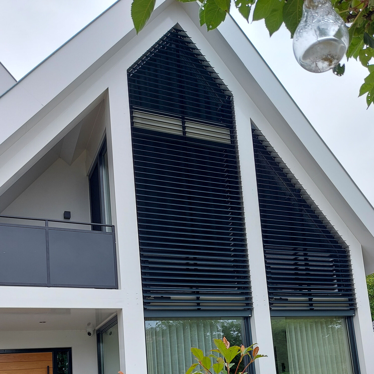 Hier is een vrijstaande woning uitgerust met unieke louvers. Sunshield heeft bij drie ramen met bijzondere vormen, louver systemen met kantelbare lamellen geplaatst. Alle drie aan de voorgevel.