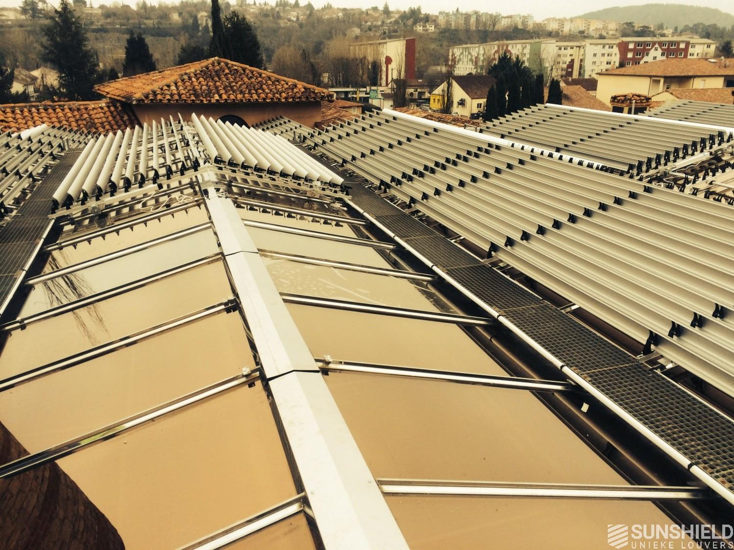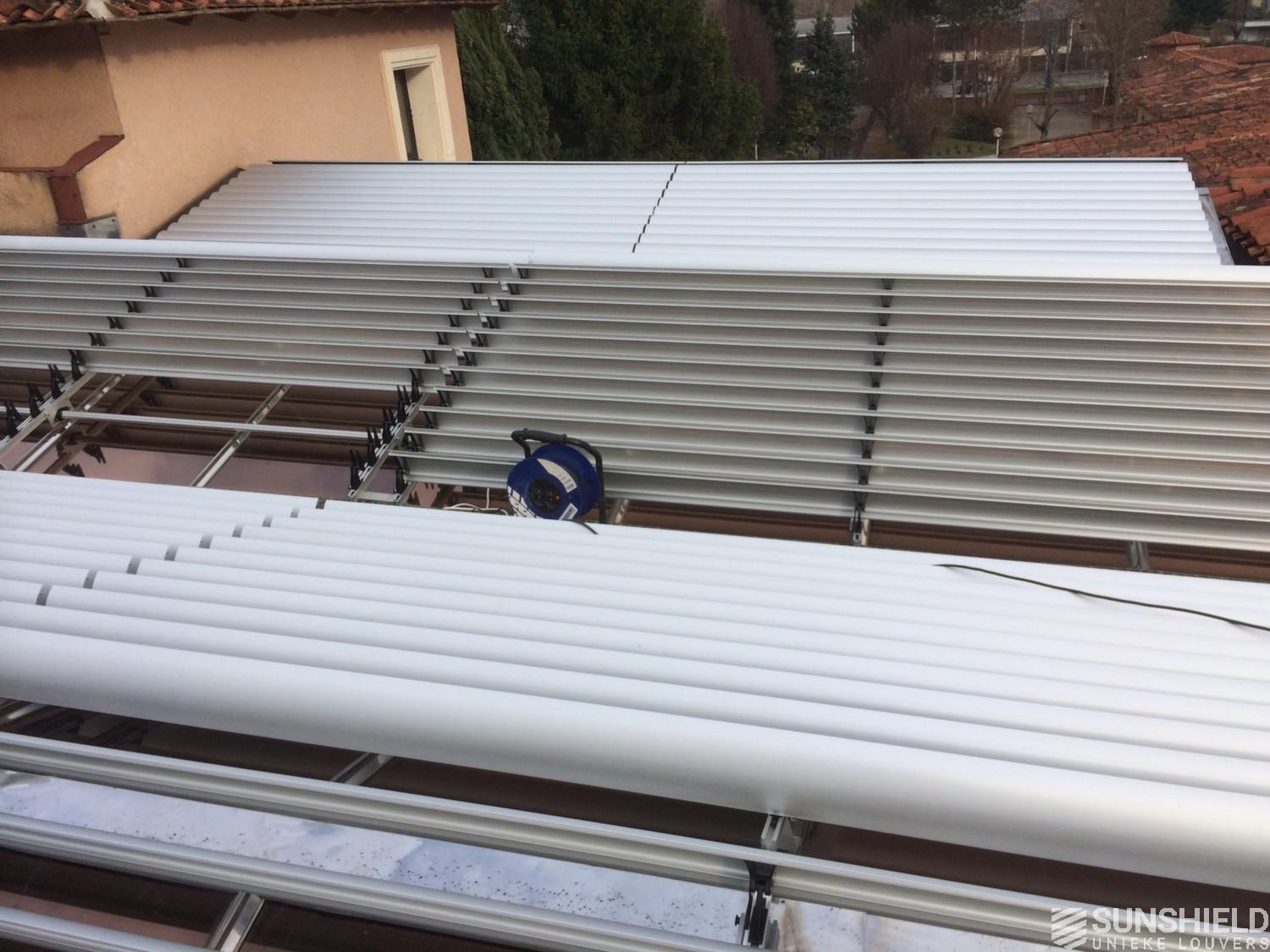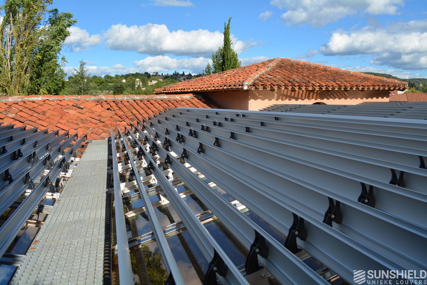 The solution has been designed and installed by Sunshield's business partner Selves in Montauban, with direct support of Somfy France for the automatic control and steering of the tilting louvers. The end result is a very robust and easy to operate system.