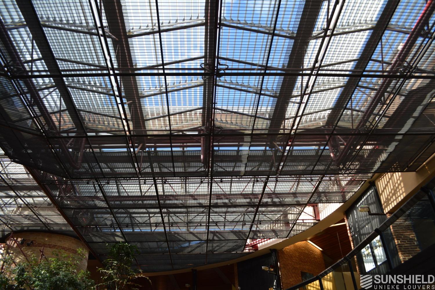 Although there was another solar protection system in place already, Banque Populaire in Cahors (France) decided to invest in Sunshield 145-E system. An upgrade with full automatic control of Somfy, to control sun- and daylight and to avoid the severe solar heating problems for the close to the 1000 m2 fully glazed atrium.