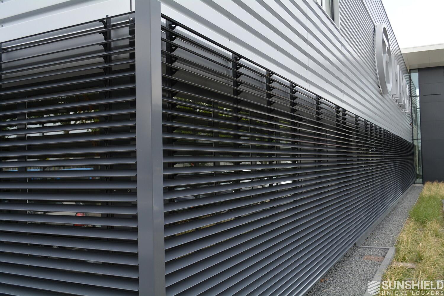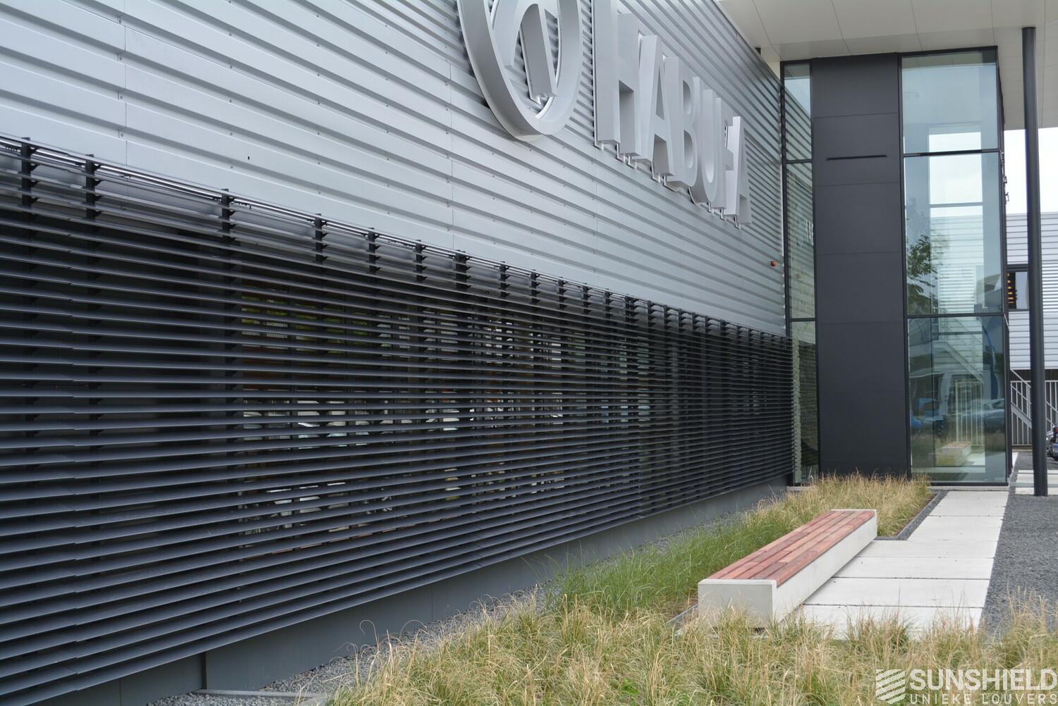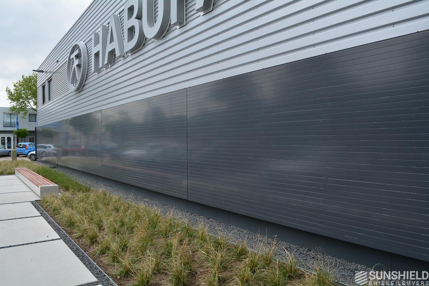 Here, the south and west facades of the Habufa Furniture building are fitted with unique louvers. By Sunshield.