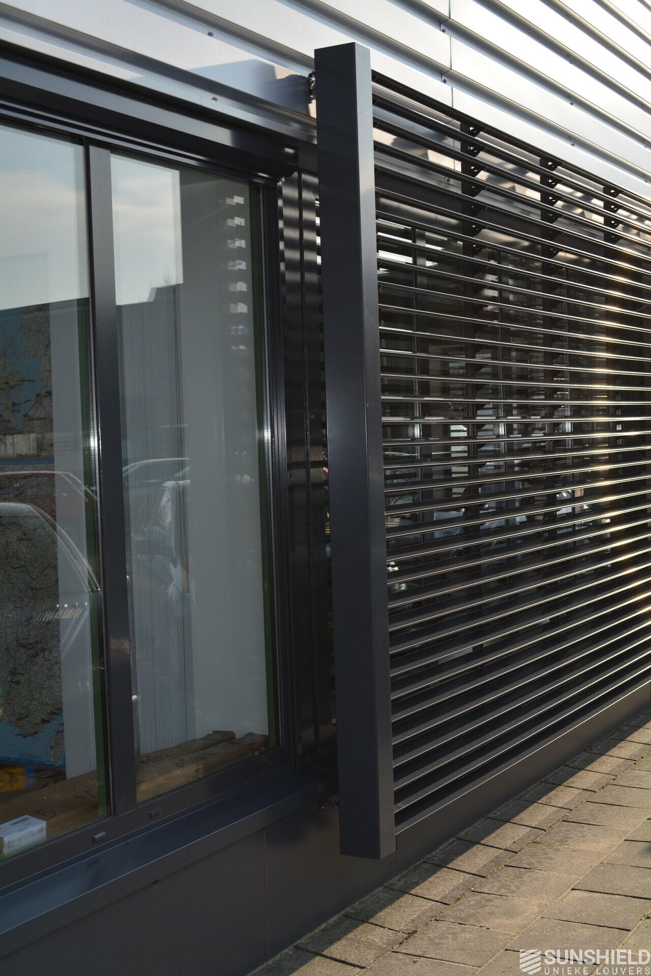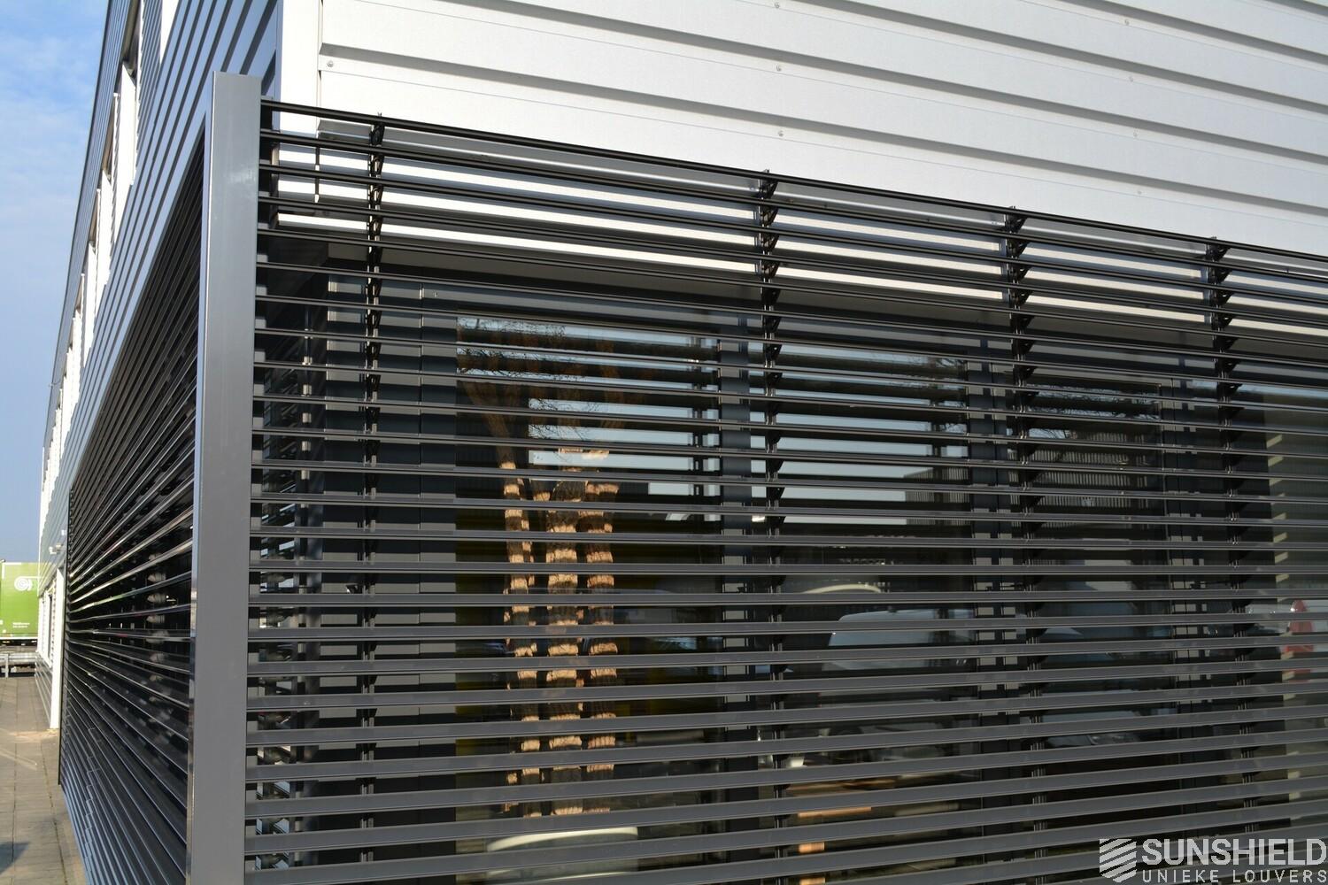 The louver systems start a little below the windows and extend slightly above the windows. The total surface area is 90 m2 divided over 7 systems, each operated separately.