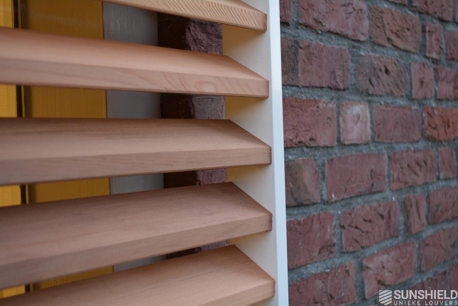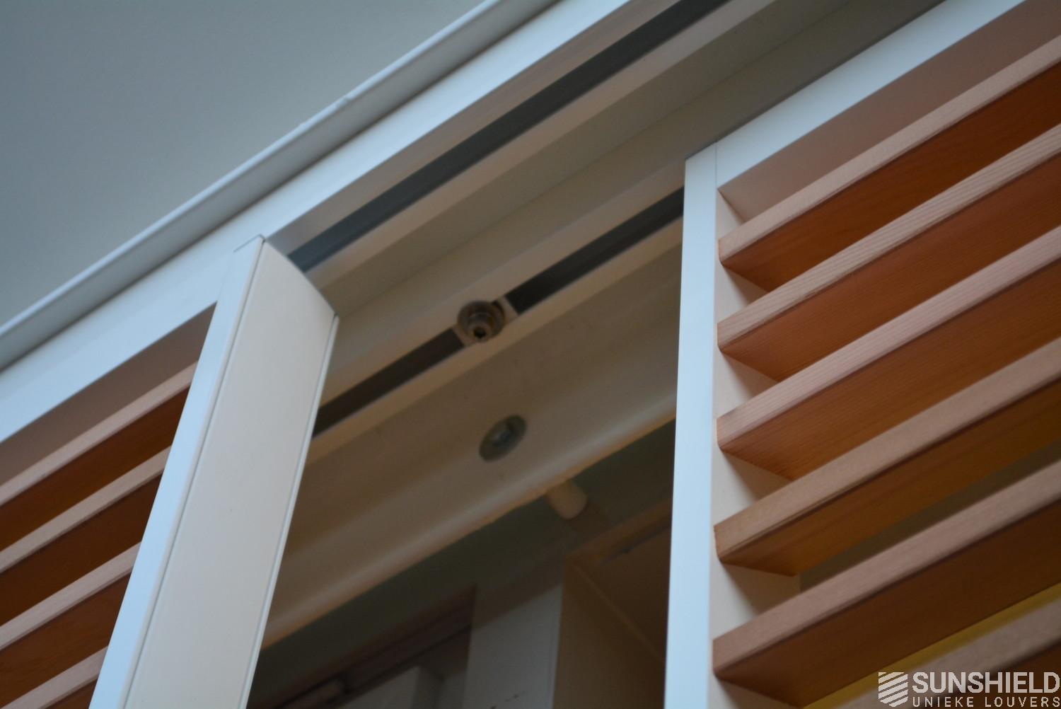 Met de houten 68W louver zijn hier glijdende zonneschermen geïnstalleerd. Een glijdend scherm bevindt zich voor een deur (of een raam) en staat in een geleider. Een dergelijk scherm fungeert als een zonnescherm met vaste louvers. Het voordeel is dat het scherm zijwaarts kan schuiven. De deuren zijn dan vrij toegankelijk.