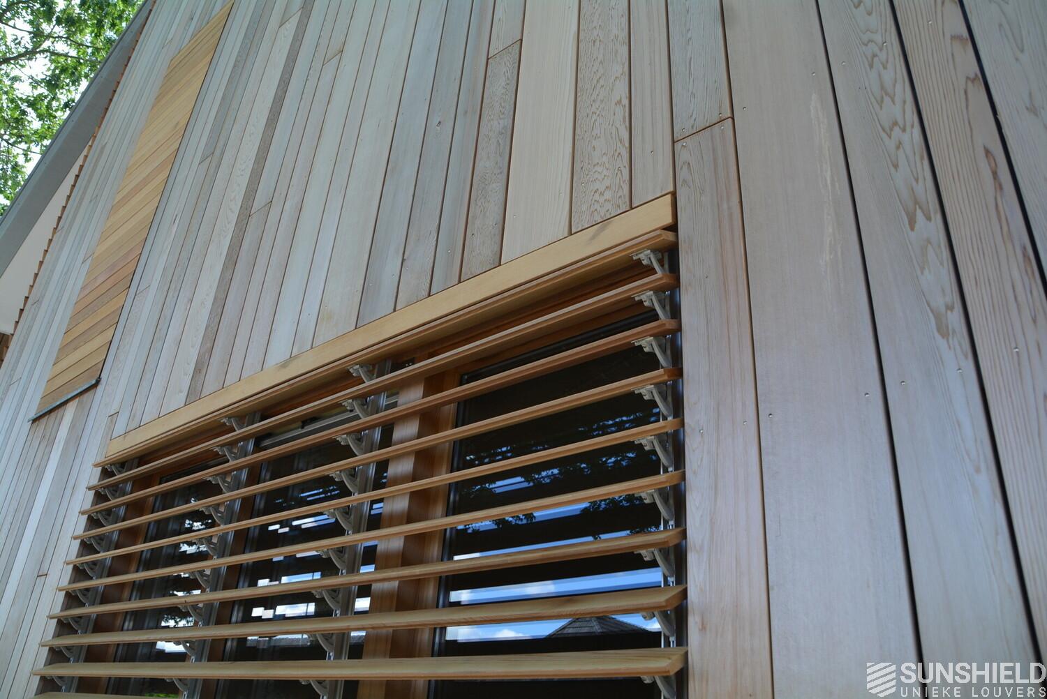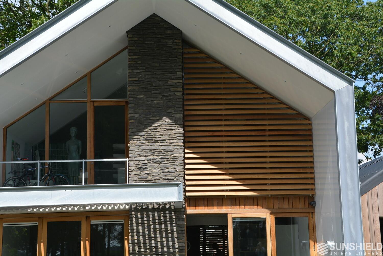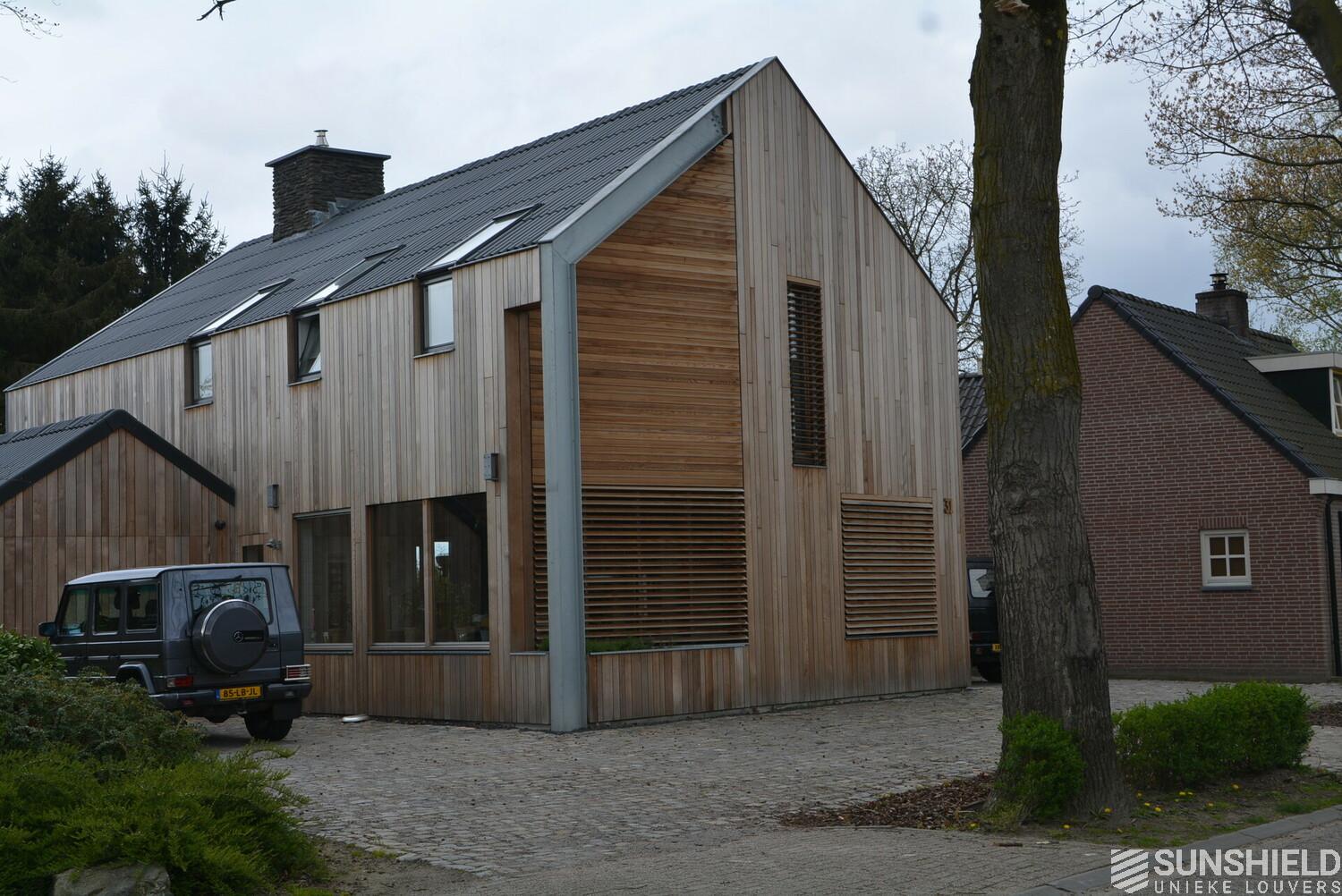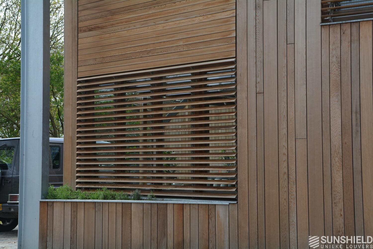The facades of the striking house are clad with Iroko wood. The residents also opted for wood for the louver systems. The 98-W louver is used at the front and the 148-W at the rear. When the slats are fully open, these louvers have a view through of respectively 90 and 140mm.