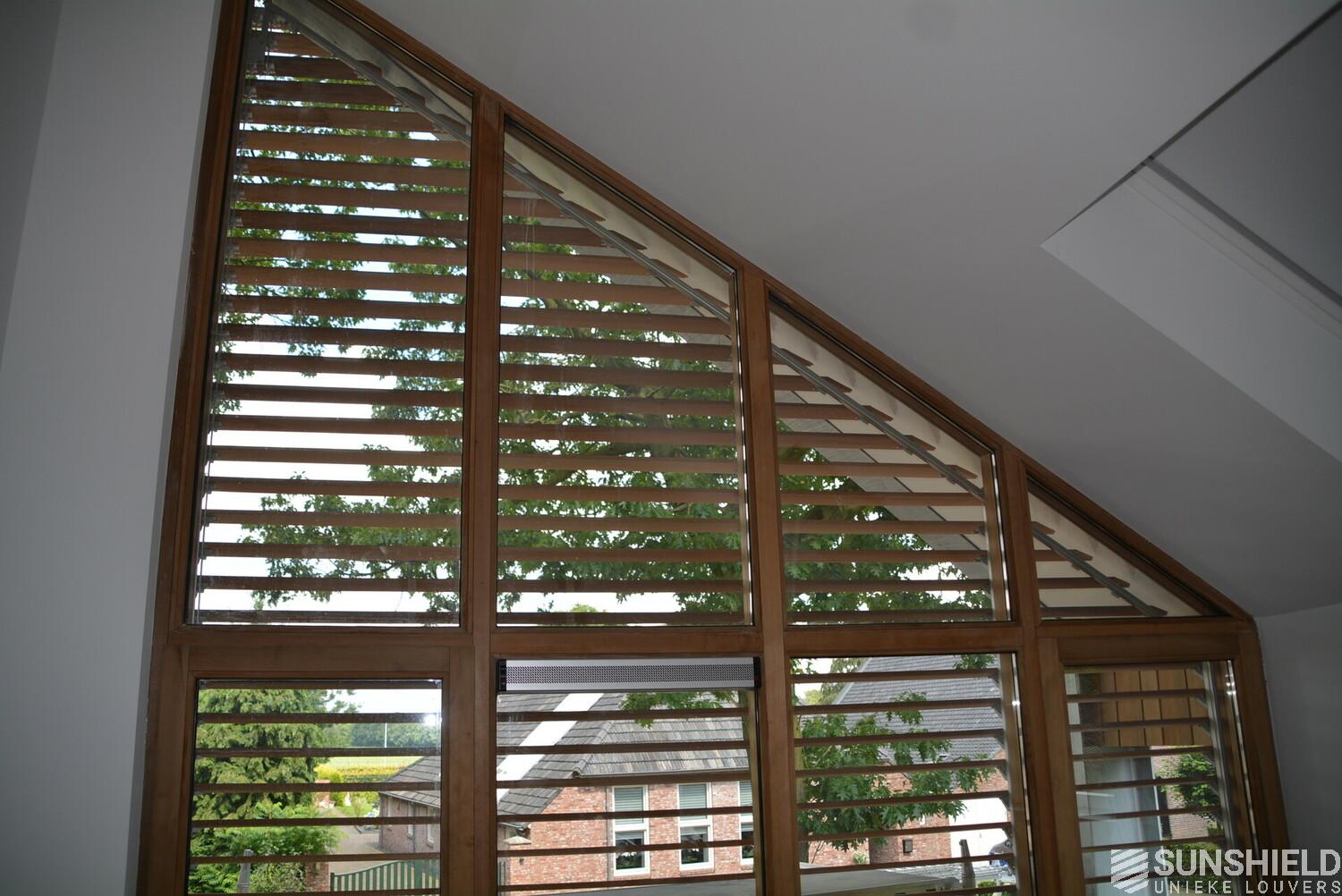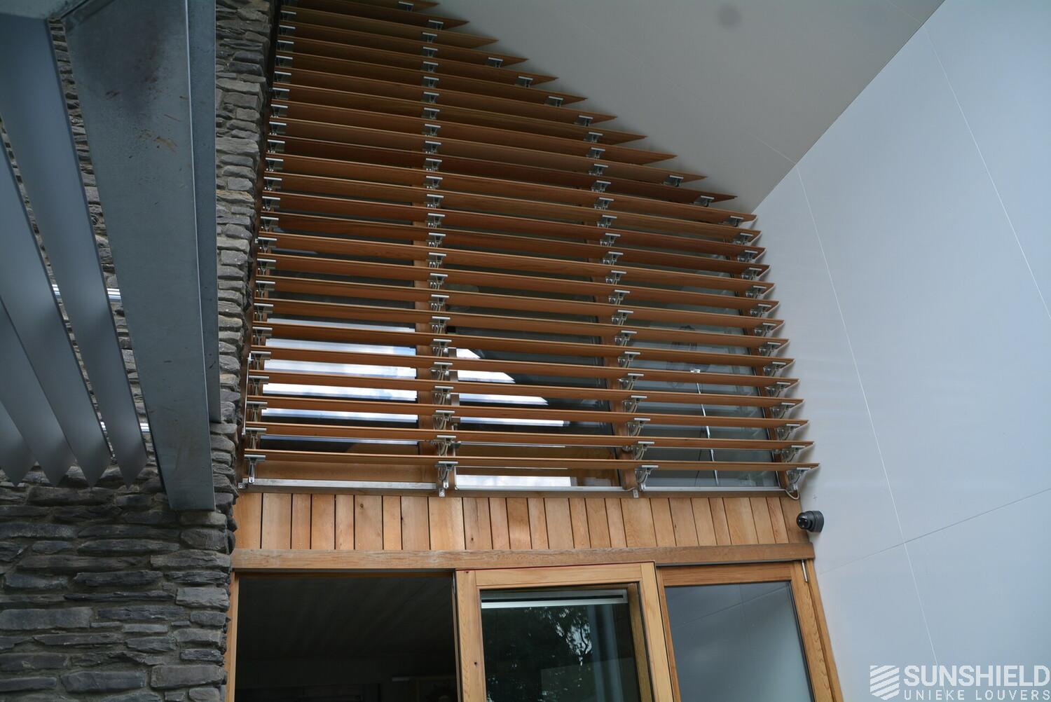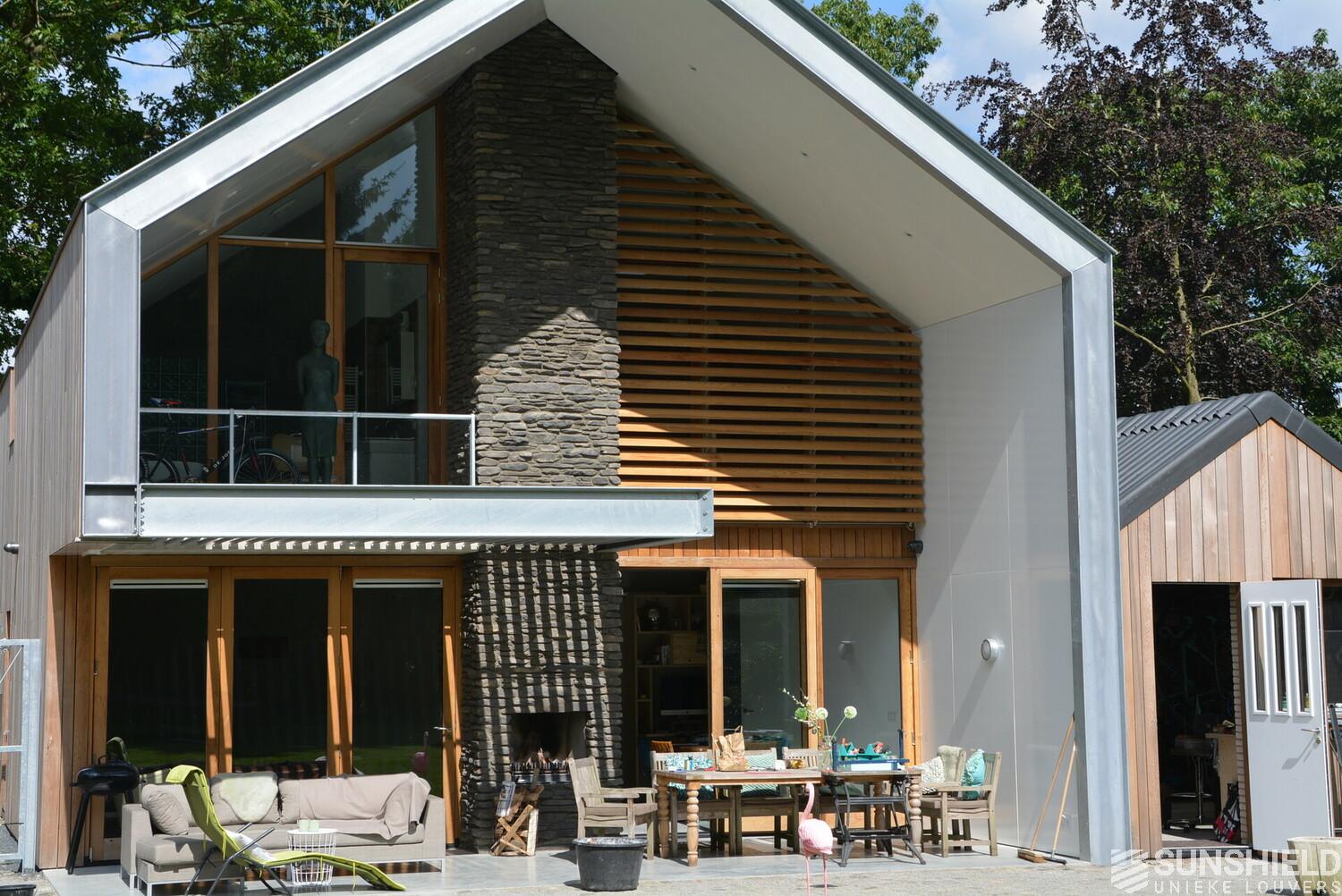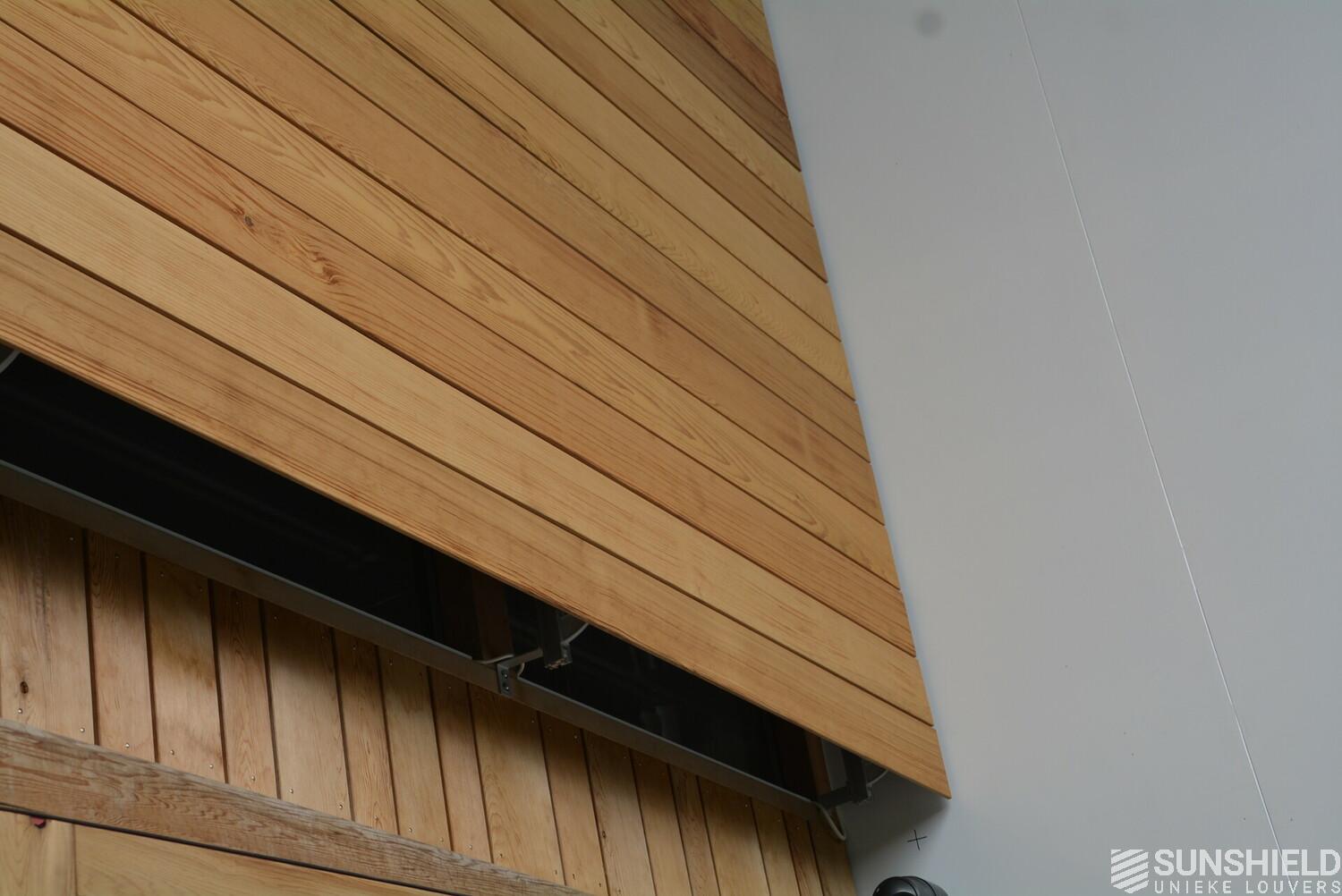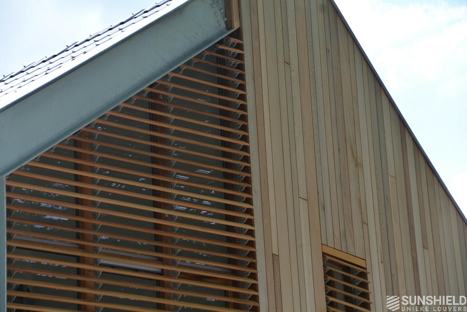 The facades of the striking house are clad with Iroko wood. The residents also opted for wood for the louver systems. The 98-W louver is used at the front and the 148-W at the rear. When the slats are fully open, these louvers have a view through of respectively 90 and 140mm.