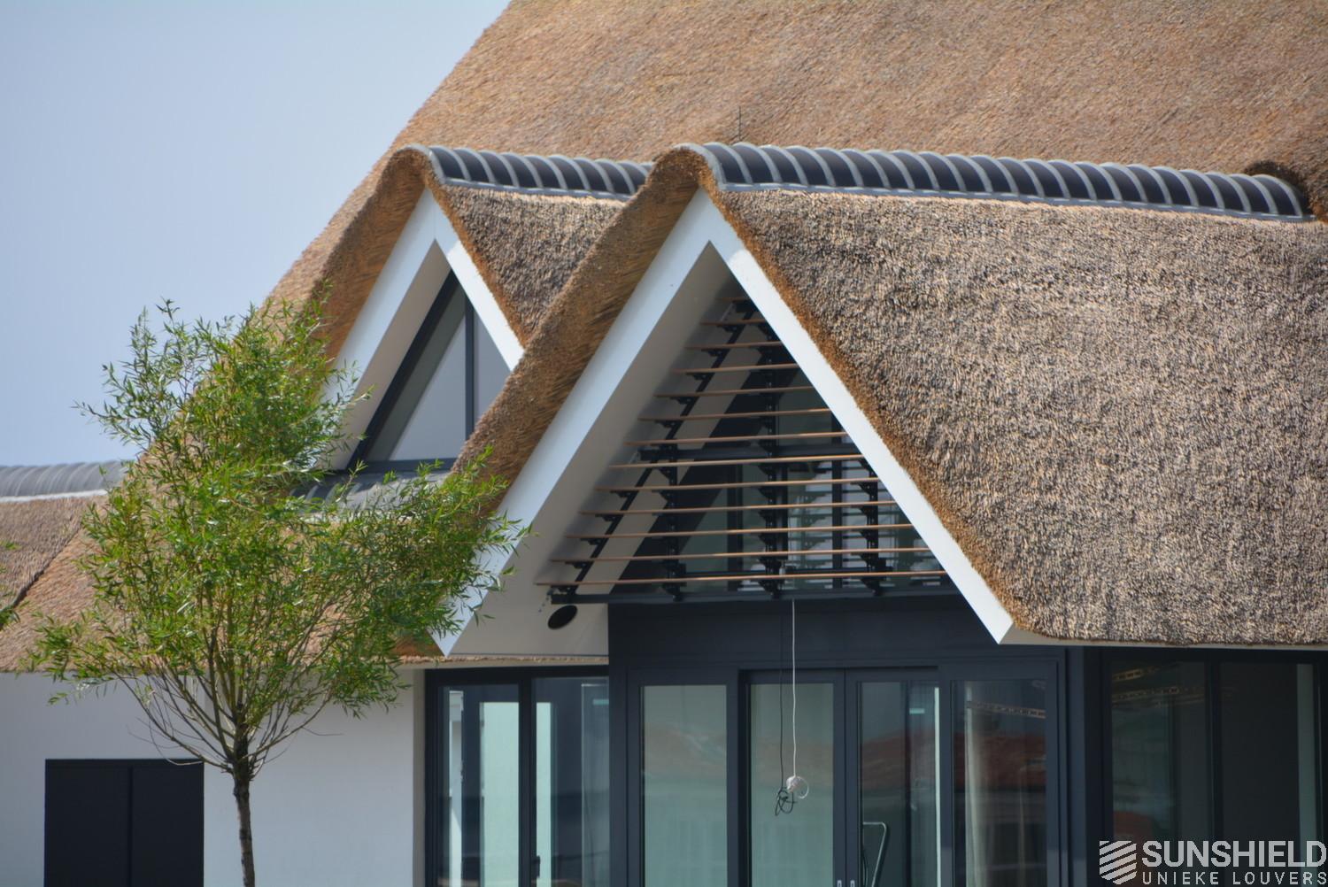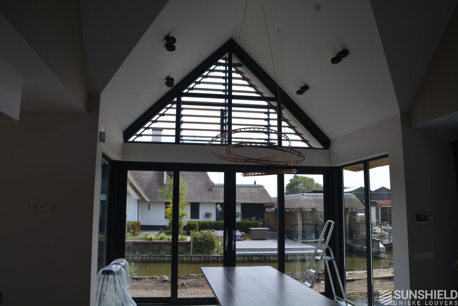 The triangular louver system has an area of a little over 3 m2. The louvers are opened and closed using a remote control. Or placed in any desired position in between, that is stepless.