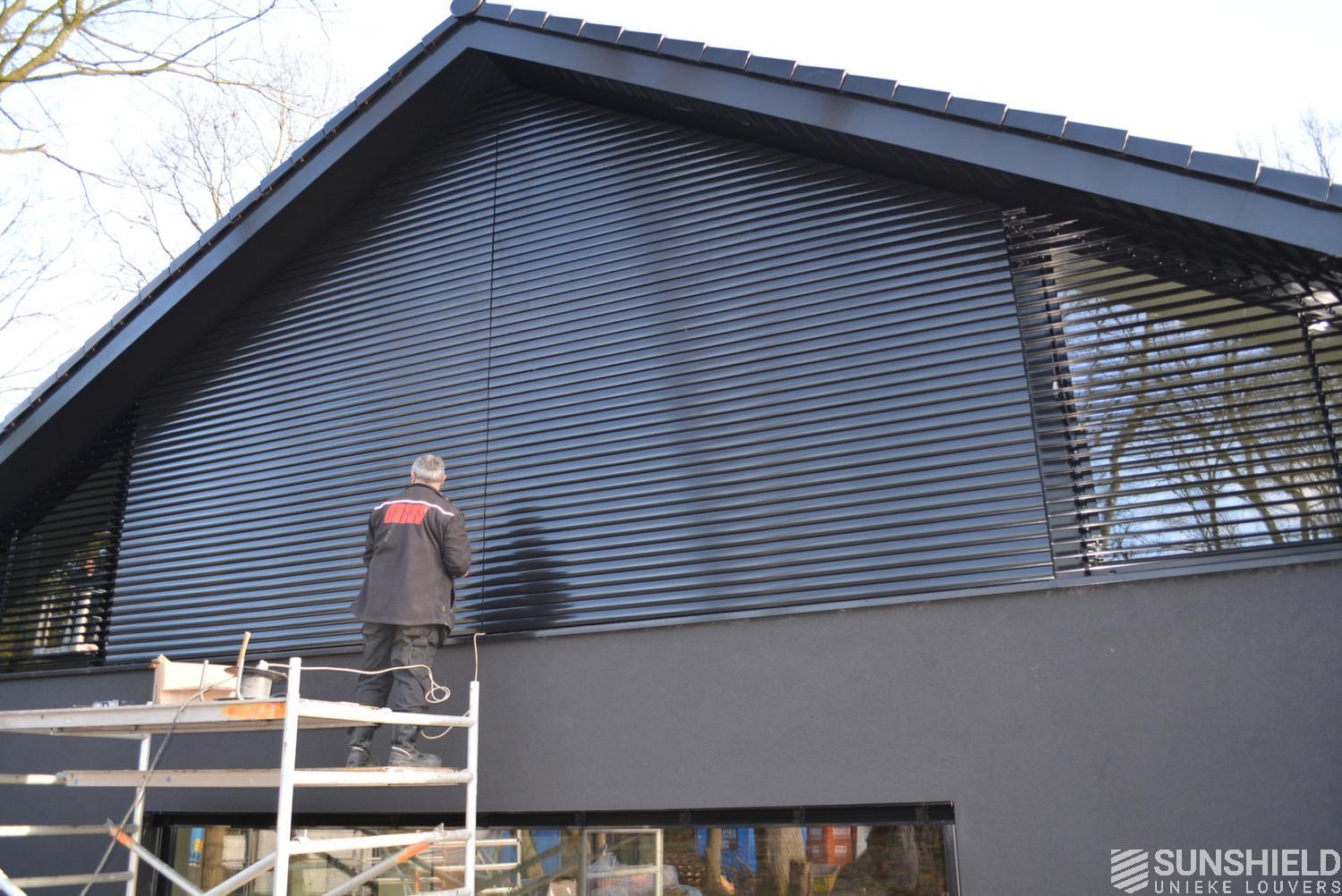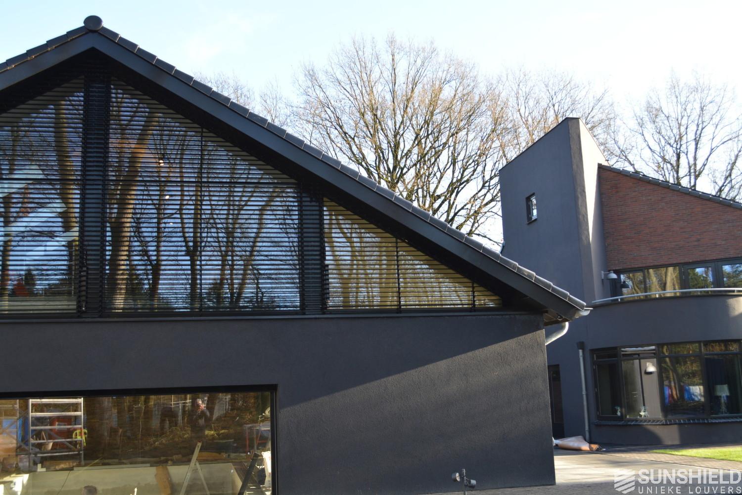 In this newly built house, an office was created above the wellness area. The total width is 14 meters. The large middle section is the office. The smaller left and right triangles, belong to the wellness area. The chosen 75E louver is a very rigid extruded aluminium louver. So hardly any risk of damage compared to traditional Venetian blinds. The louvers, system and motors are all RAL-9004, in line with the rest of the building. The drawing of this triangle can be found in the following download: Technical drawing.