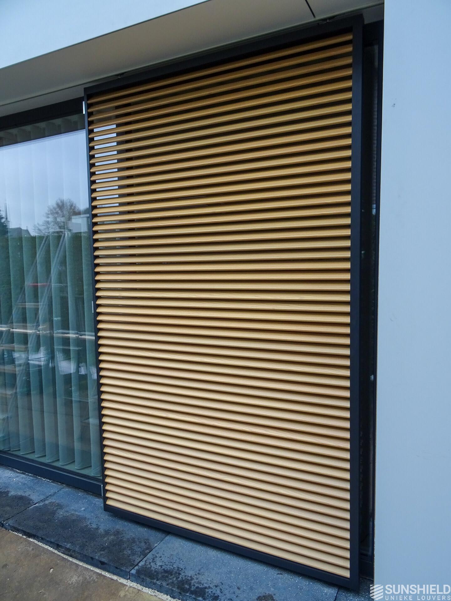 All slats are made of wood print of the type Oak. The other aluminium parts, like the frames of the sliding panels and the rack arms of the louvers, are coated in RAL 7021. This provides a really nice contrast.