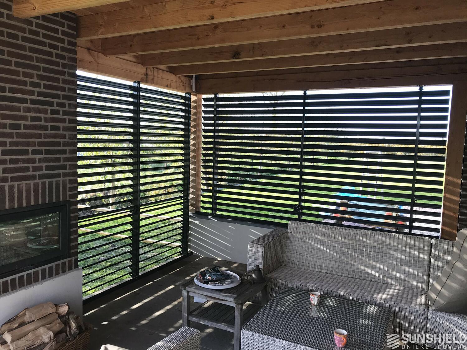 Here is the terrace of a characteristic, detached house fitted with two slatted walls. By Sunshield. With these louver systems, each nearly 6 m2, an outdoor space is transformed into a garden room.
