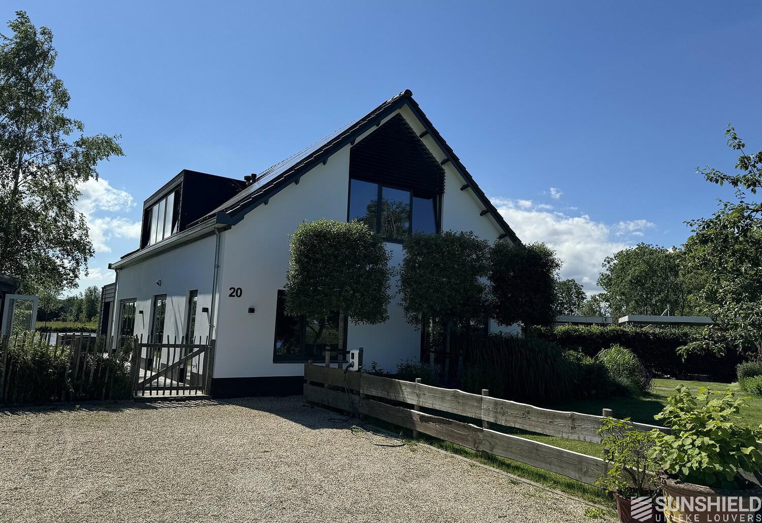 Here, the front and rear facades of a charming, detached house are equipped with unique louvers. By Sunshield.