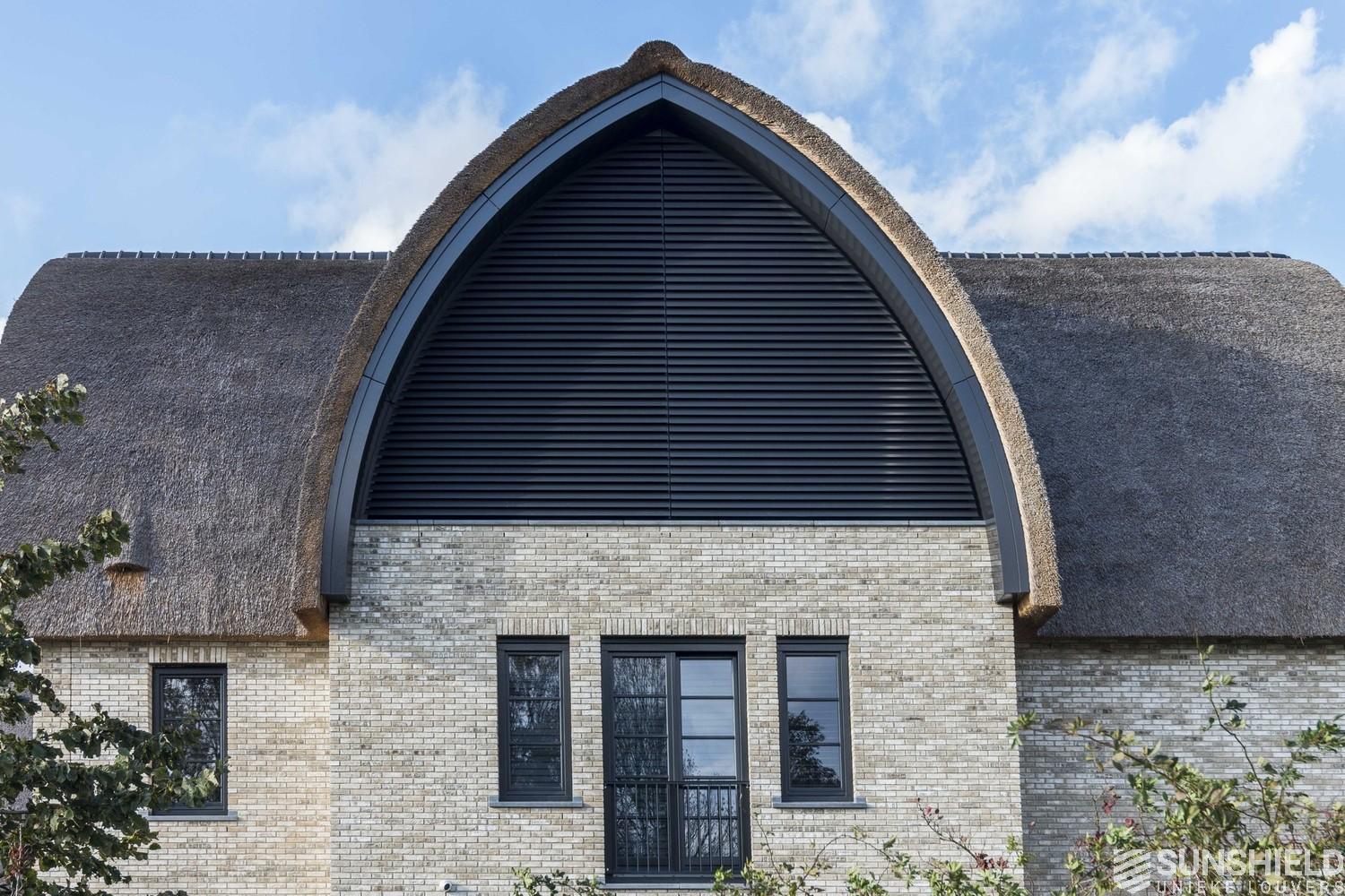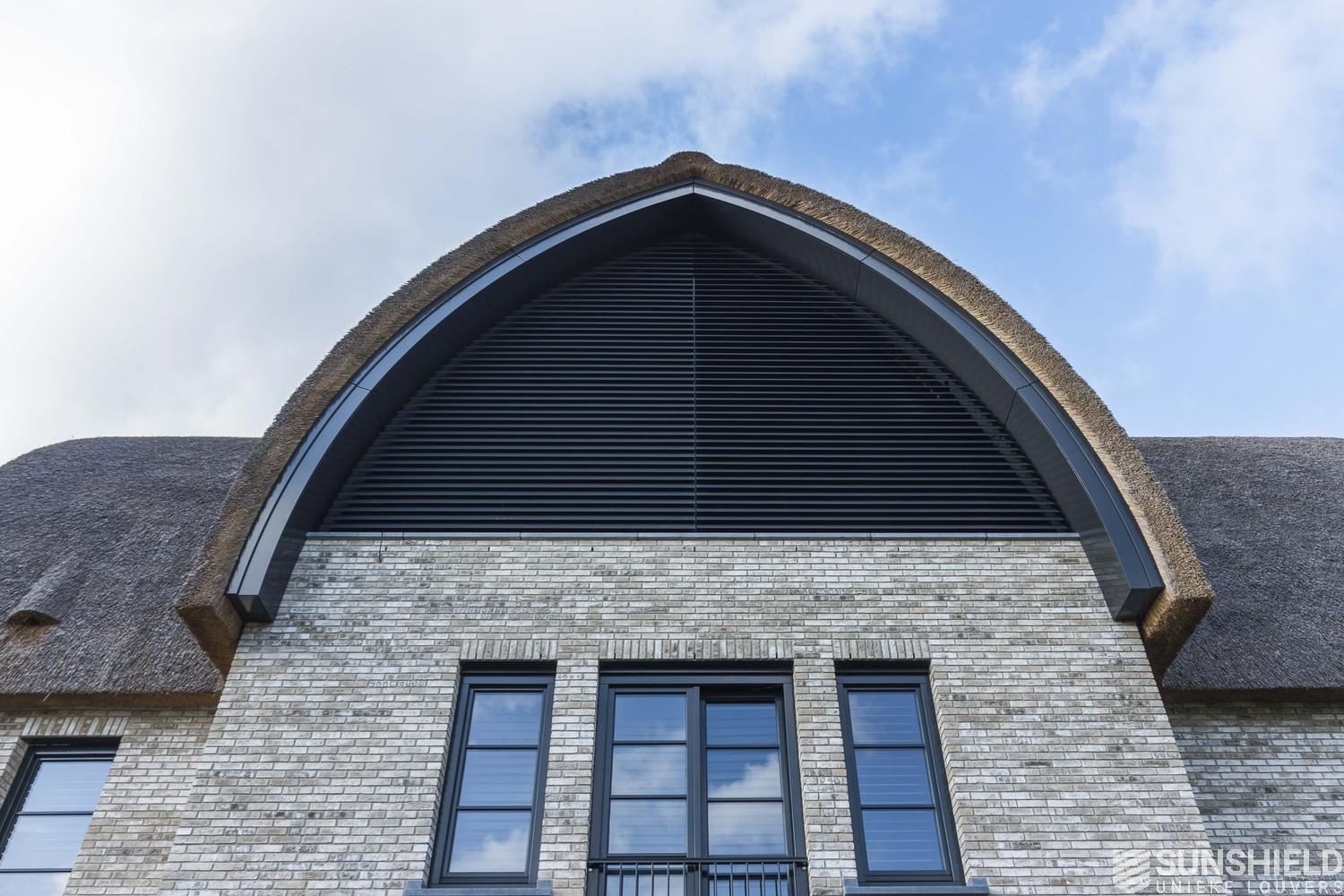 The 96-E louver was chosen for this arc shaped sun protection. The aluminium parts are coated in RAL 7021 – black grey. The jet moulded plastic parts are black.