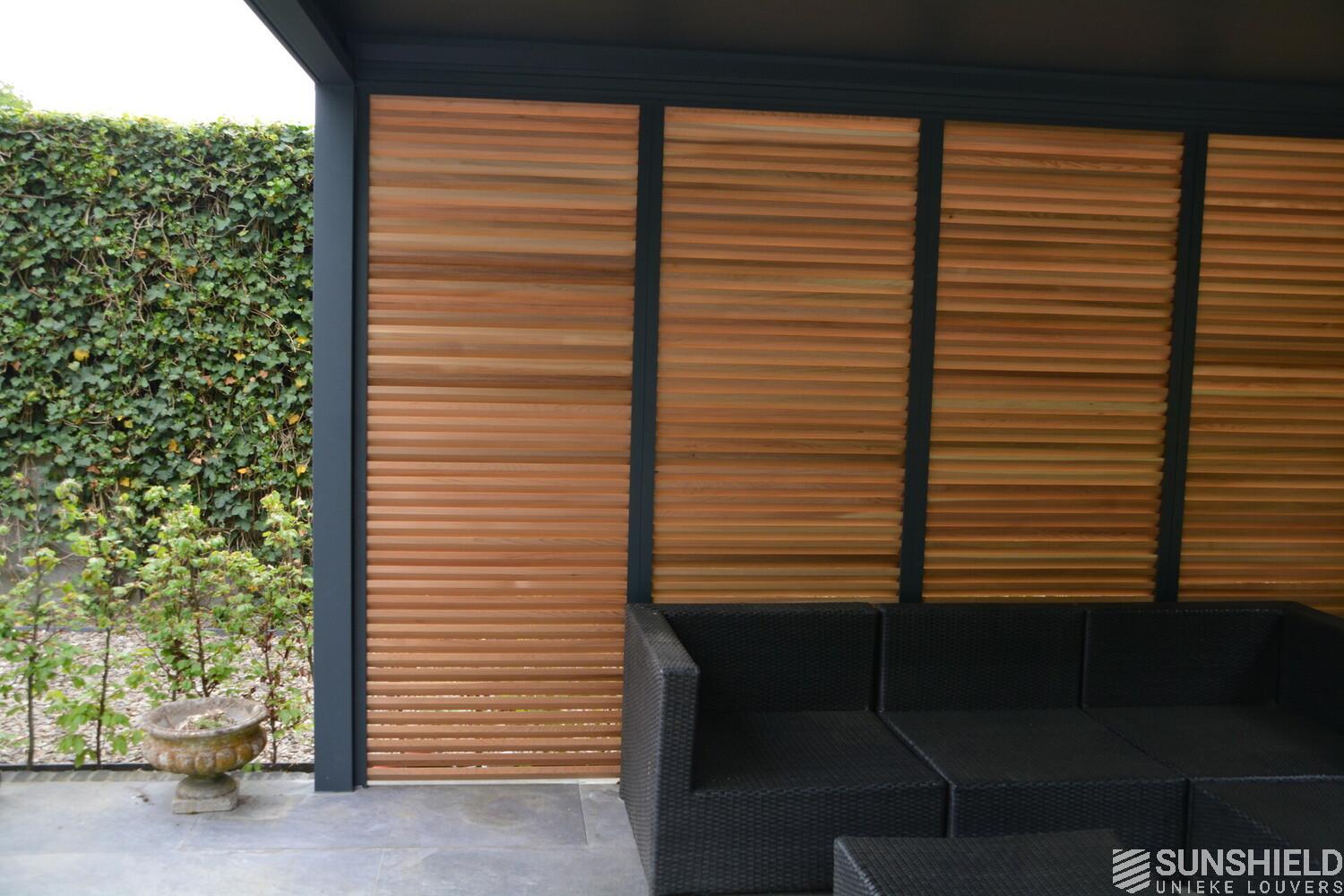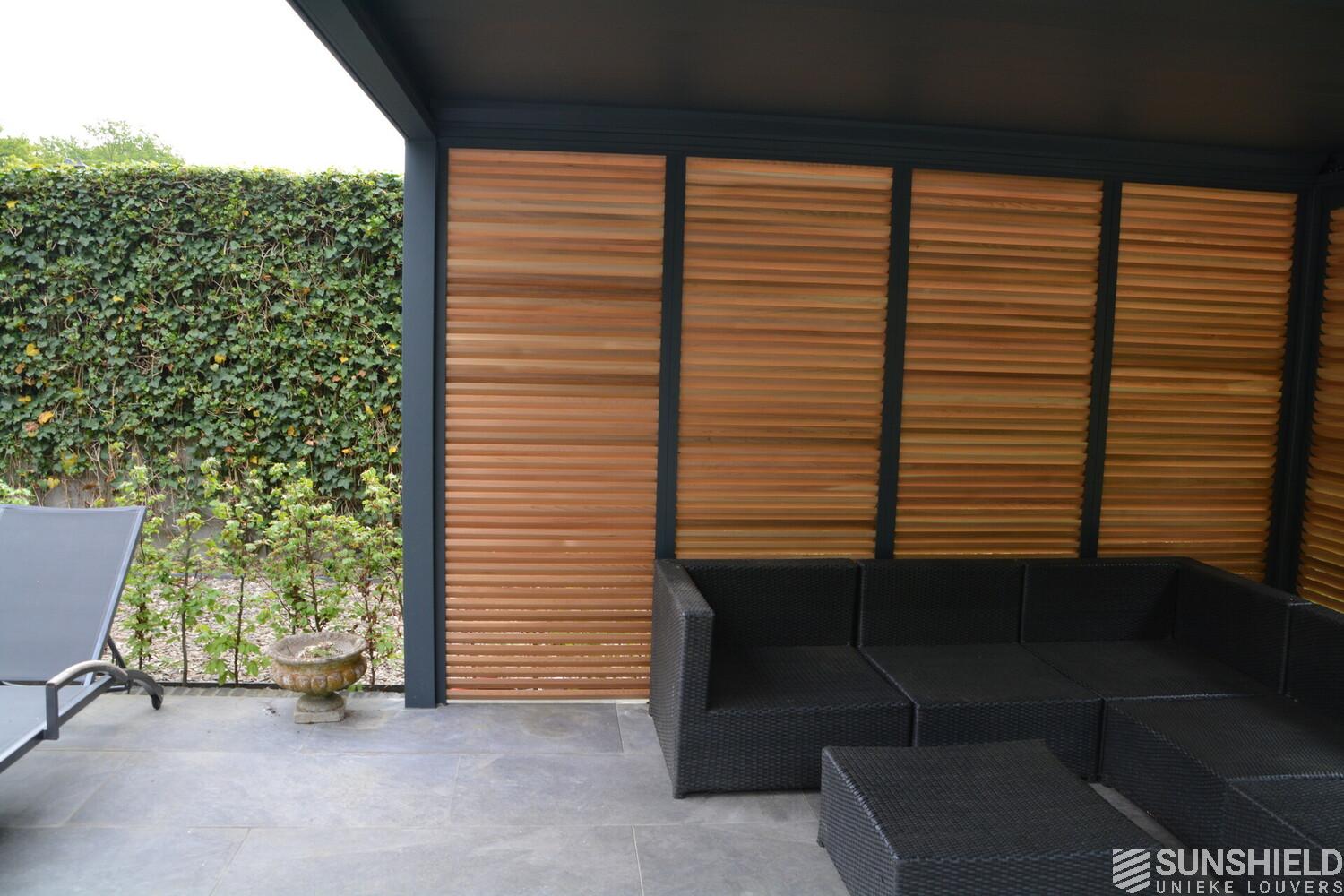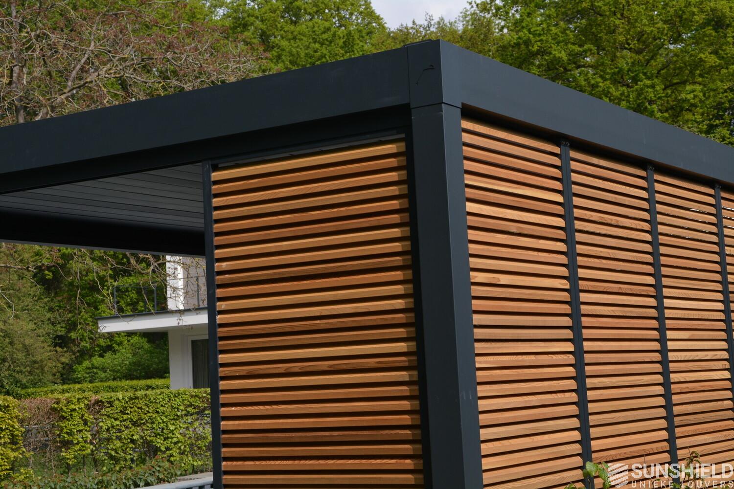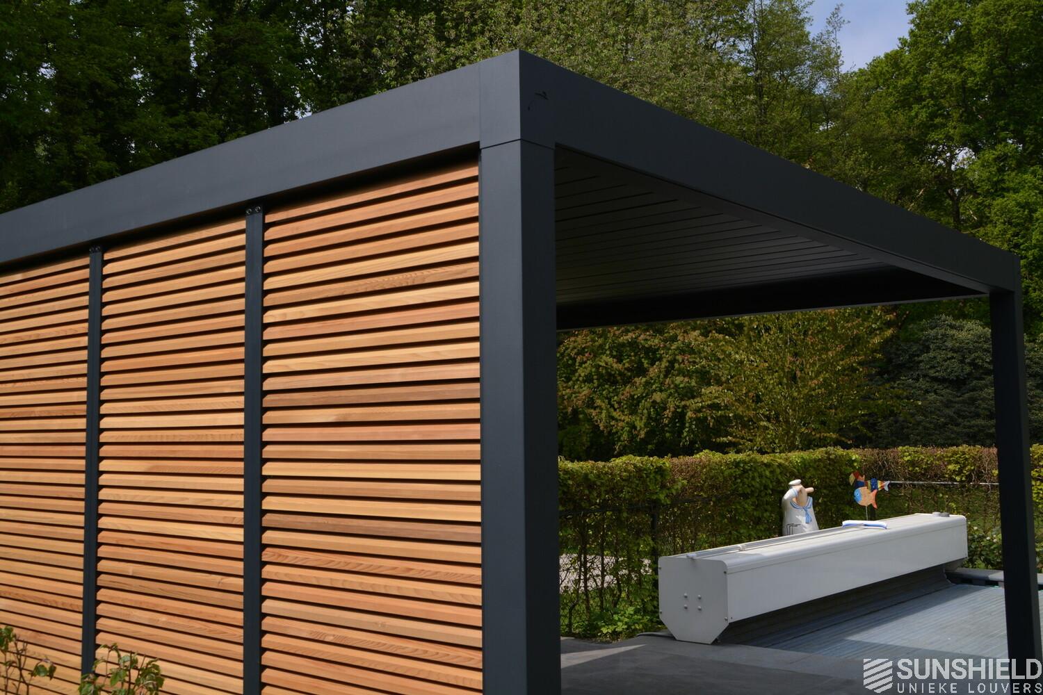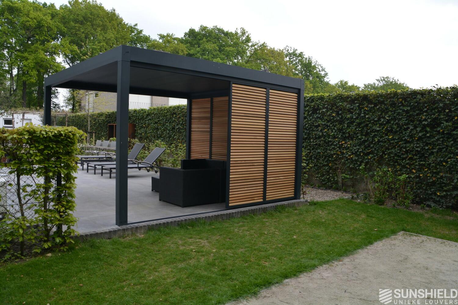 First, Sunshield created a louvered roof measuring 4 by 4 meters. Then, the rear wall was closed with four fixed panels, while two sliding panels are placed in the short wall on the outside.