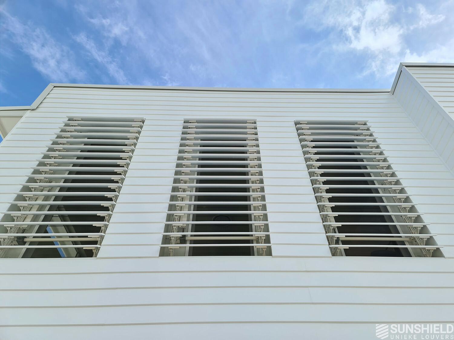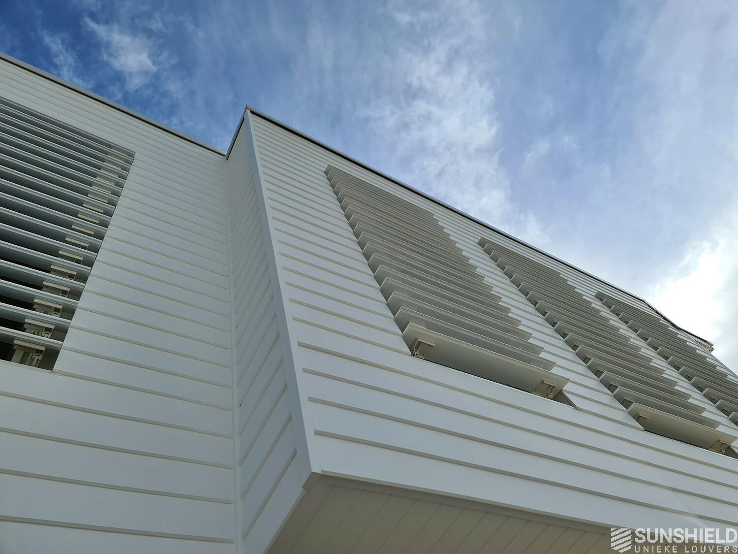 The developer of a new construction project in the south of Sydney is charmed by Sunshield's louver systems. In this case he preferred wooden slats. In fact, he preferred to have blades made of the same wood as the wooden cladding on the first floor.