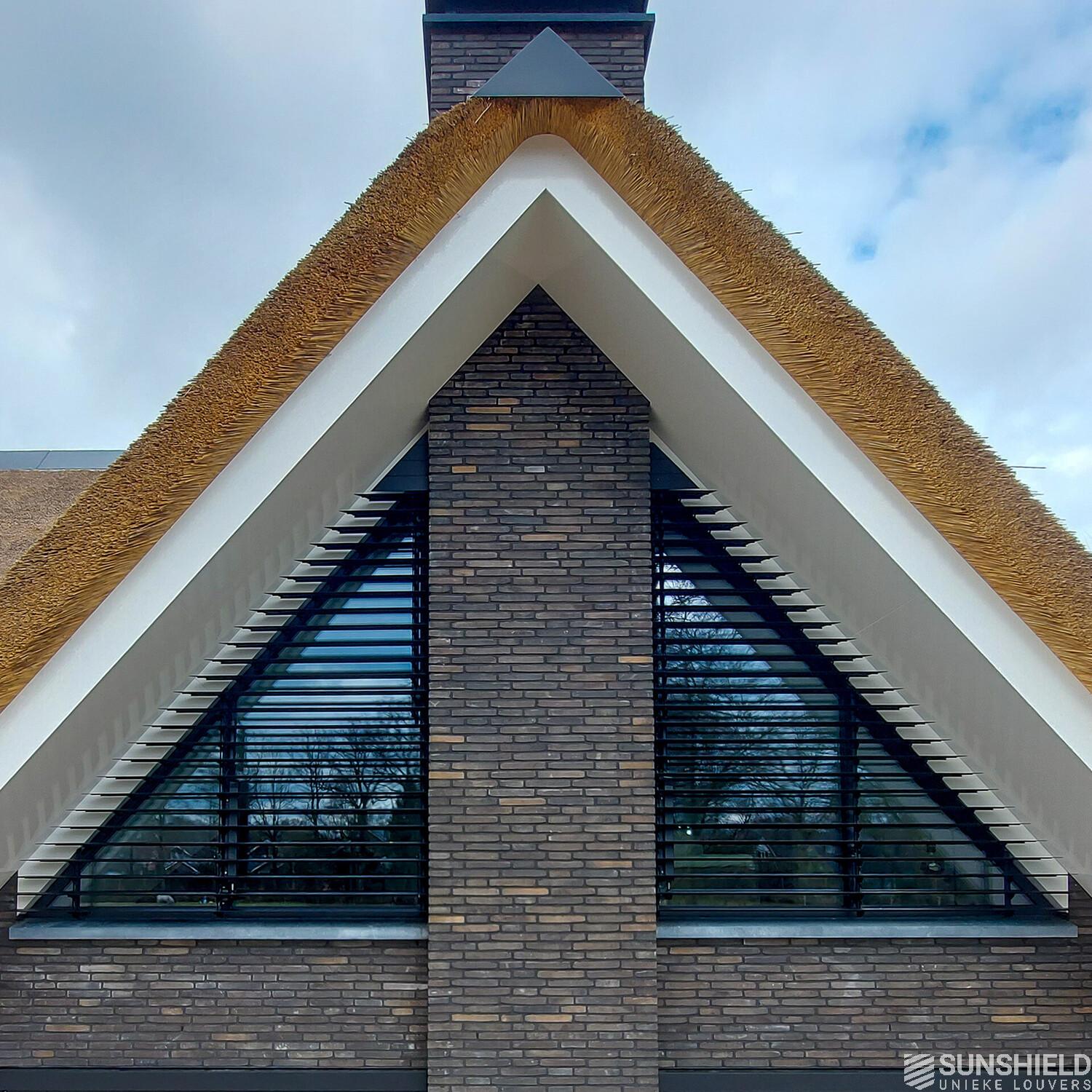Three louver systems are completely identical. These pentagons start at the base as a rectangle. After half a meter the shape changes into a triangle that ends with its point in the ridge.