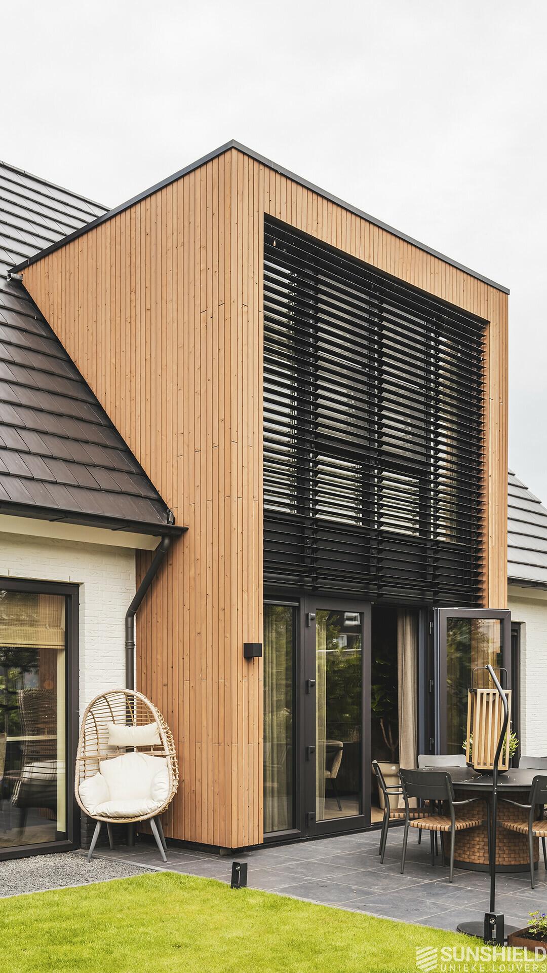 This residence has a beautiful risalit at the front and back. The louver system has been placed in the extension at the back, at the window on the first floor to be precise.