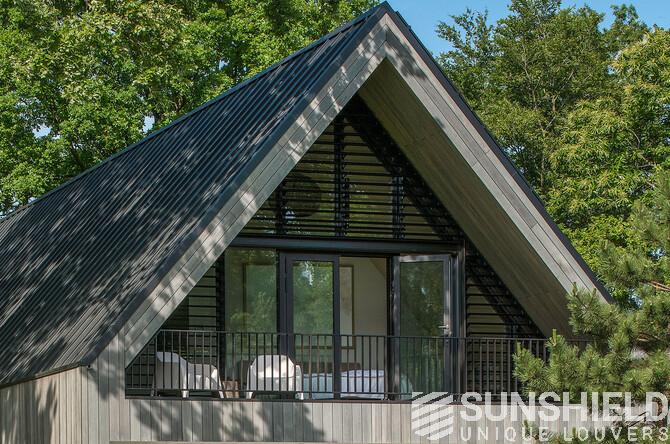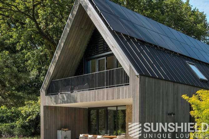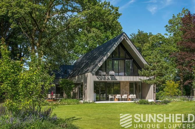 The master bedroom of the residence features unique louvers. Designed, manufactured, and installed by Sunshield, commissioned by contractor Olympa Timber Construction in Veghel (NL).