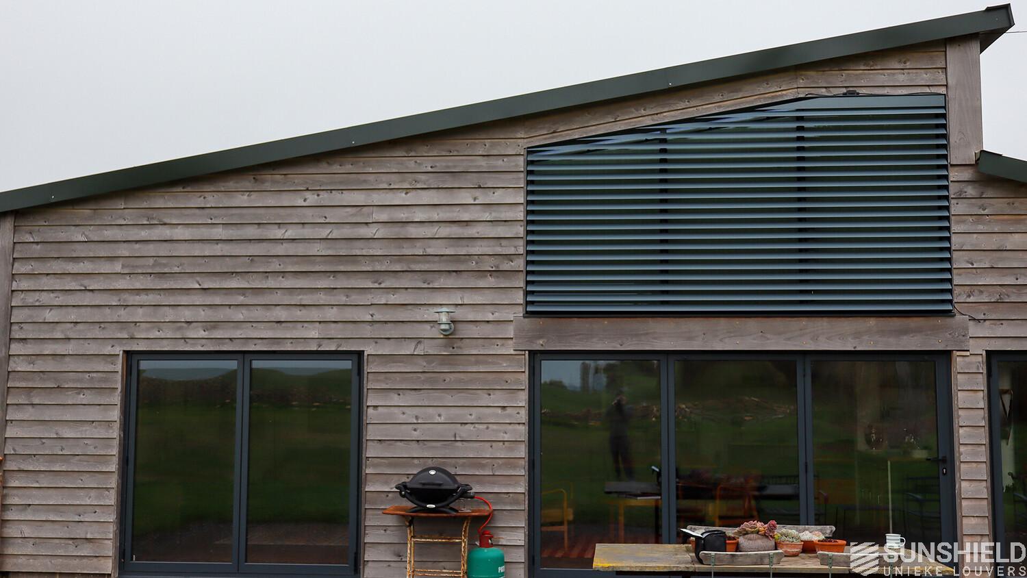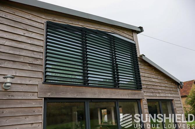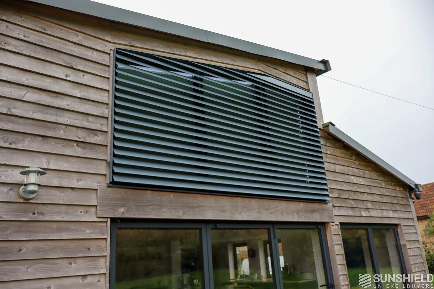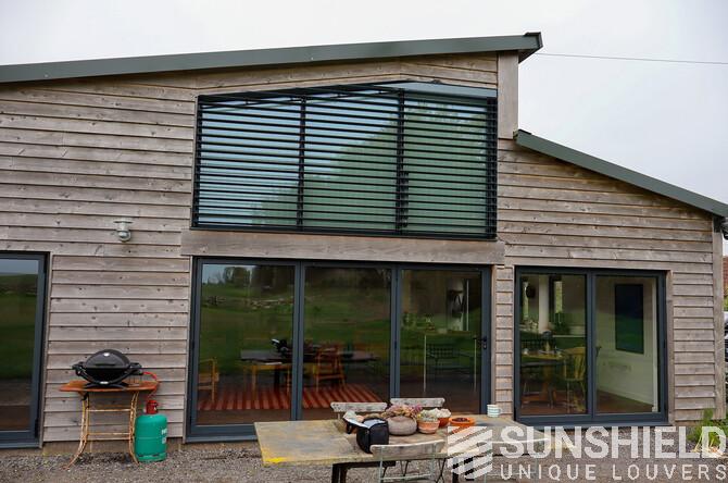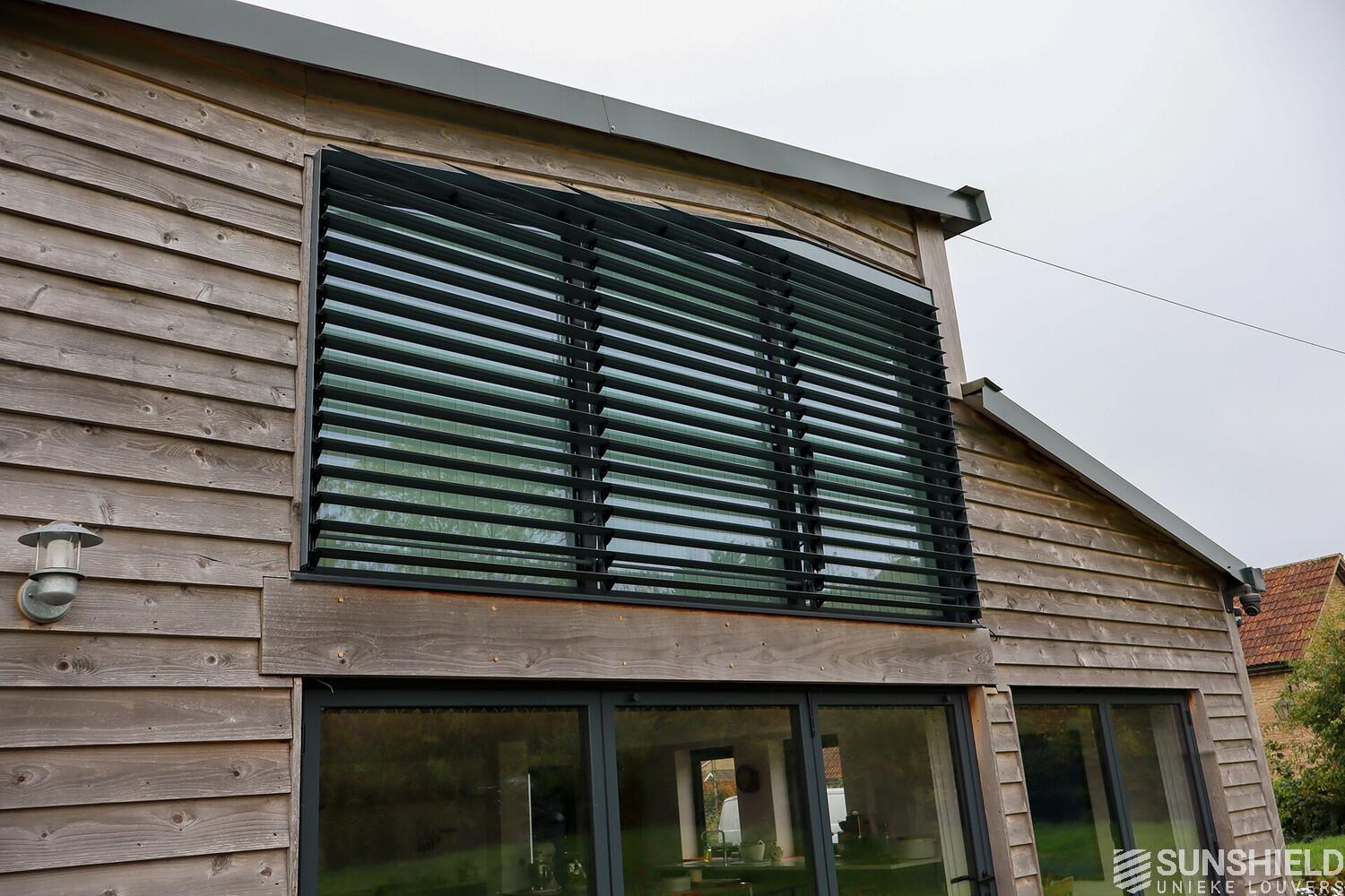 The result is a stylish and functional sun protection system that perfectly complements the architectural style of the barn. The 96-E louvers significantly reduced solar gain in the bedroom, maintaining a comfortable indoor temperature throughout the day.