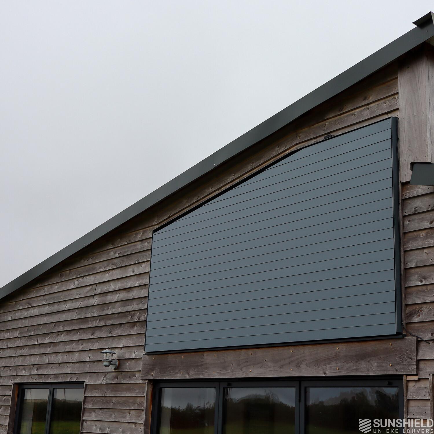 To achieve the right balance between comfort and design, the client approached SUNSHIELD UK for a bespoke sunshade. The objectives were to complement the rustic character of the barn house and, above all, an effective solution against solar gain.