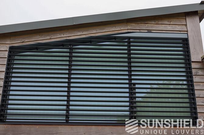 A slat system often blends in with the window recess. Because this window is not very deep, side profiles were added. These primarily prevent light from entering from the side. Furthermore, these profiles provide a sleek, clean finish to the louver system.