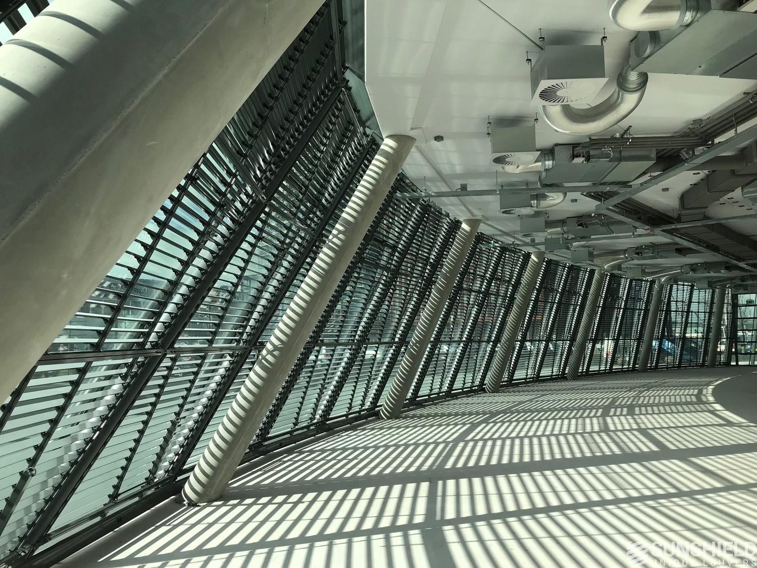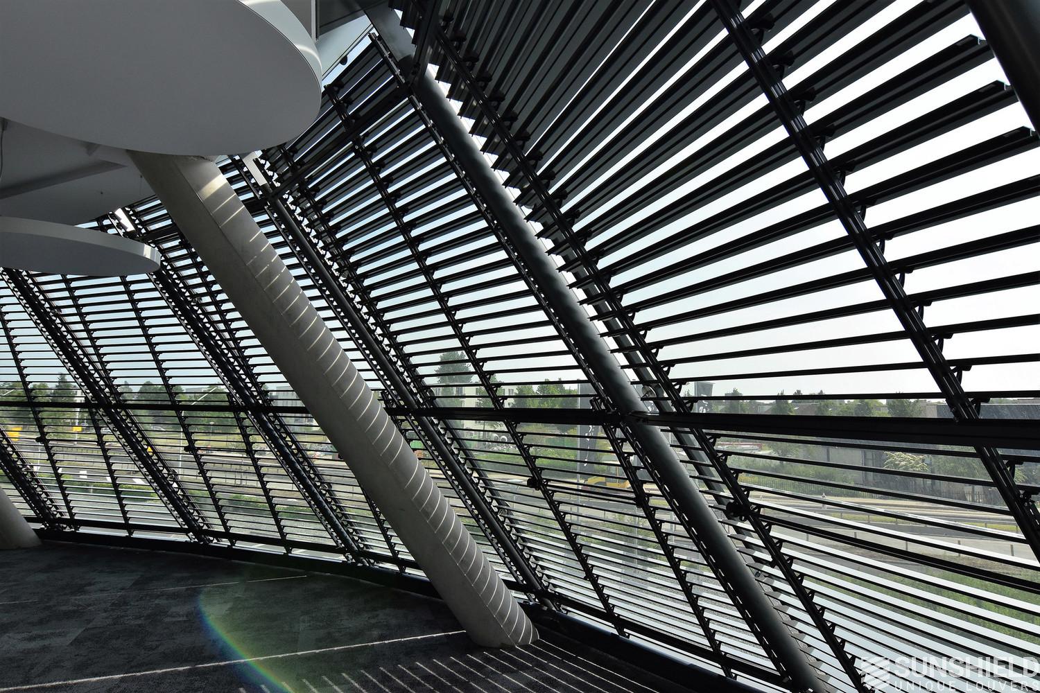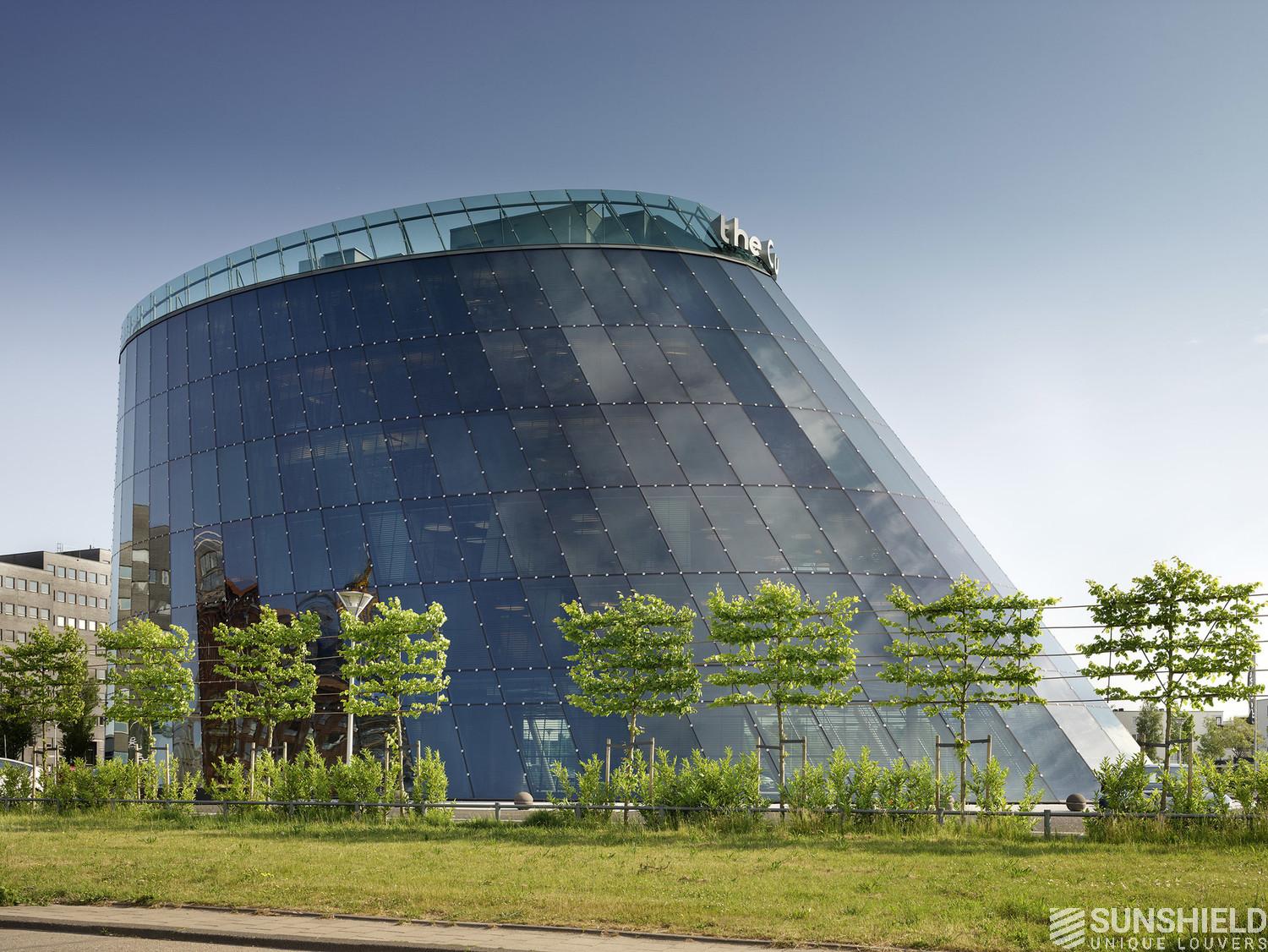 For The Curve, Sunshield has designed a system with the 96-E louver. Each individual slat is unique. Lengthwise and/or the ends are sawn at unique angles. Customization at its best.