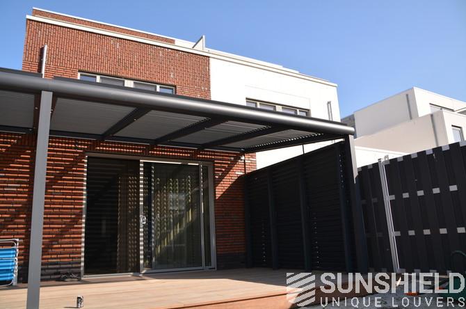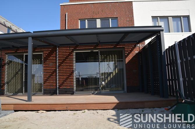 This elegant Horizon Duo Louvers roof is designed for the situation. The total size is 8,5 x 3,5 meters. The middle column is positioned at the middle of the wall of the house. The 2 compartments can be individually set in the desired louver position. When louvers are closed the louver roof is ofcourse water-proof. At the sides the 96E louvers can be operated manually. Above the 96E the space is closed with transparent plexiglass. To have a convenient situation also at more windy days.