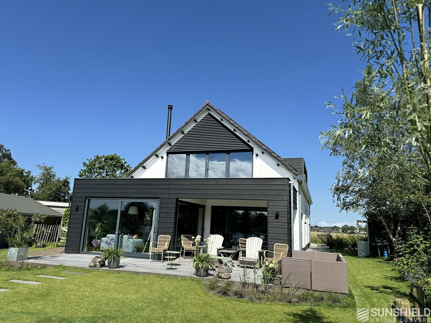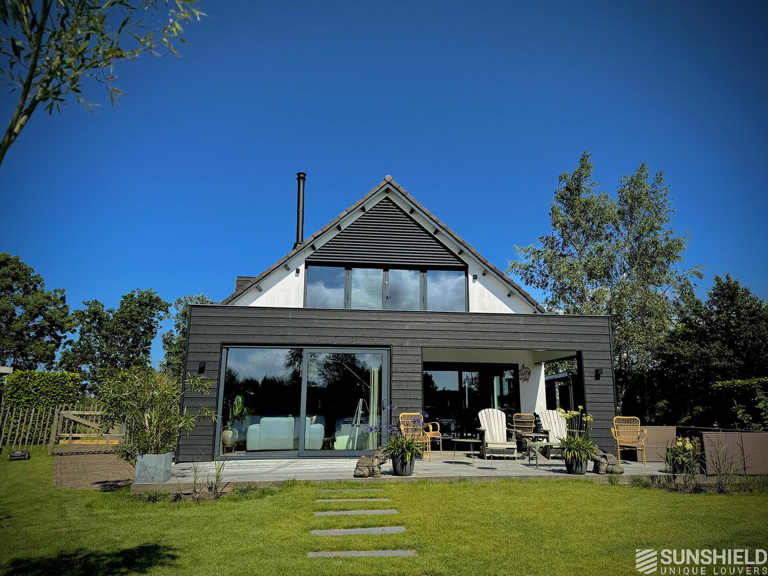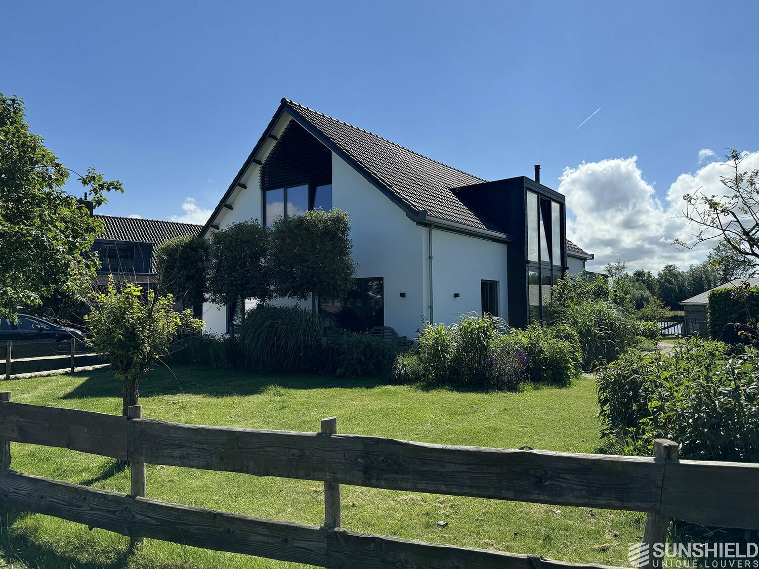 Here, the front and rear facades of a charming, detached house are equipped with unique louvers. By Sunshield.