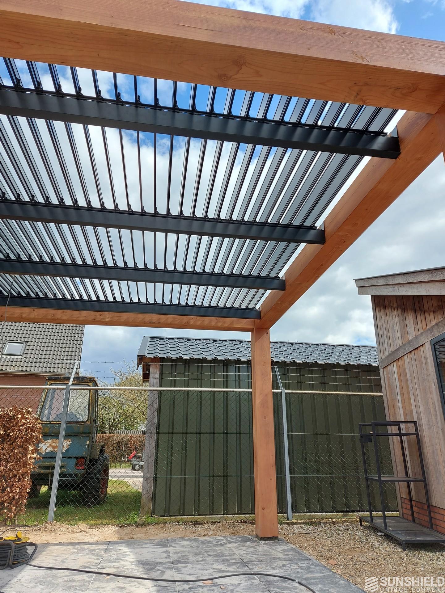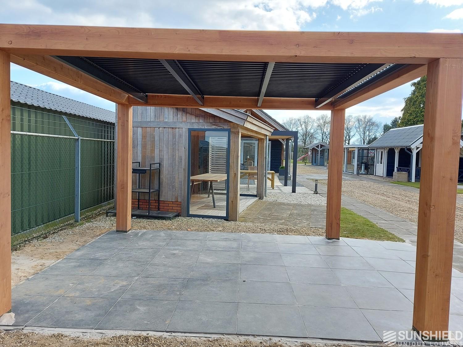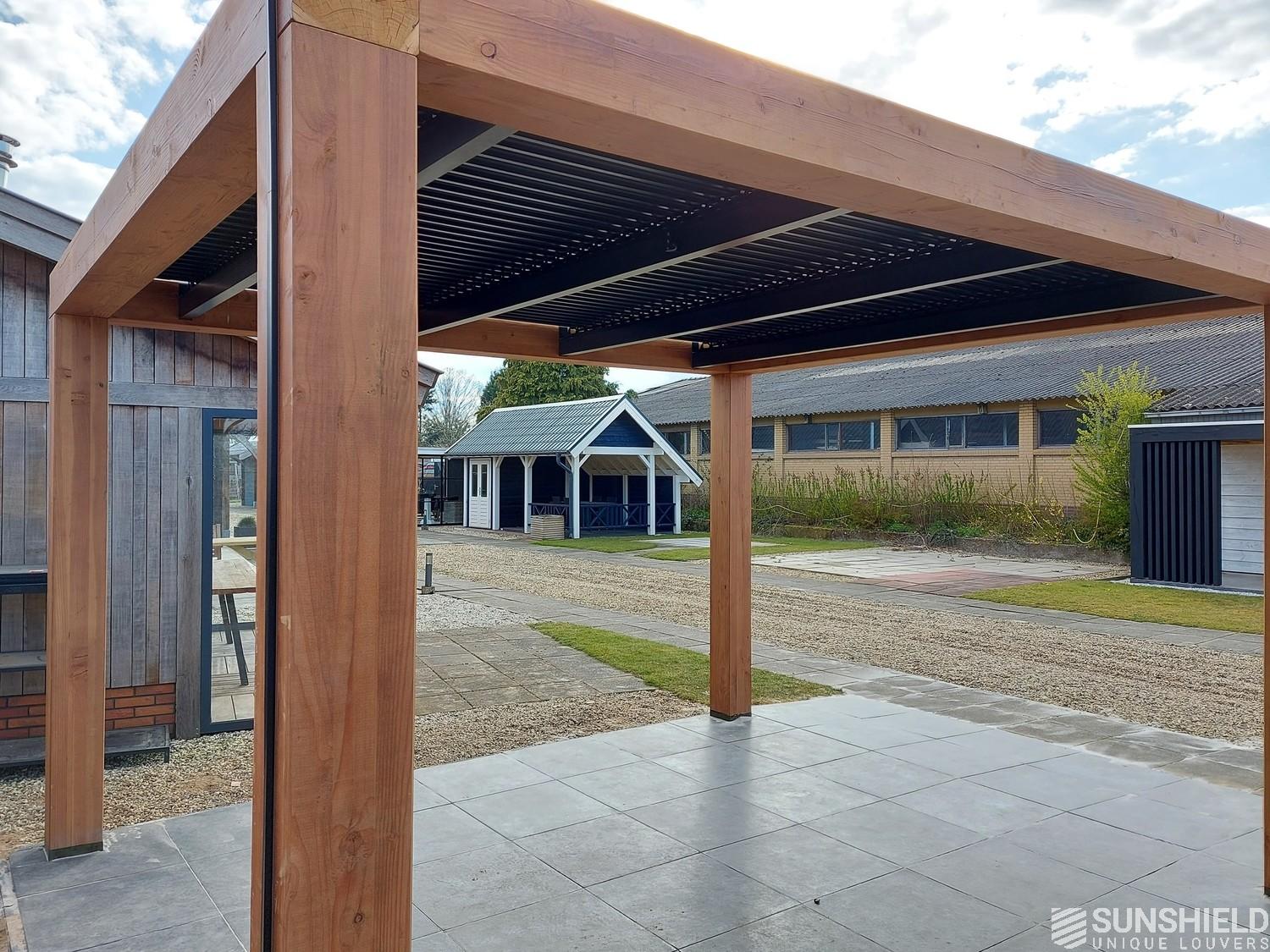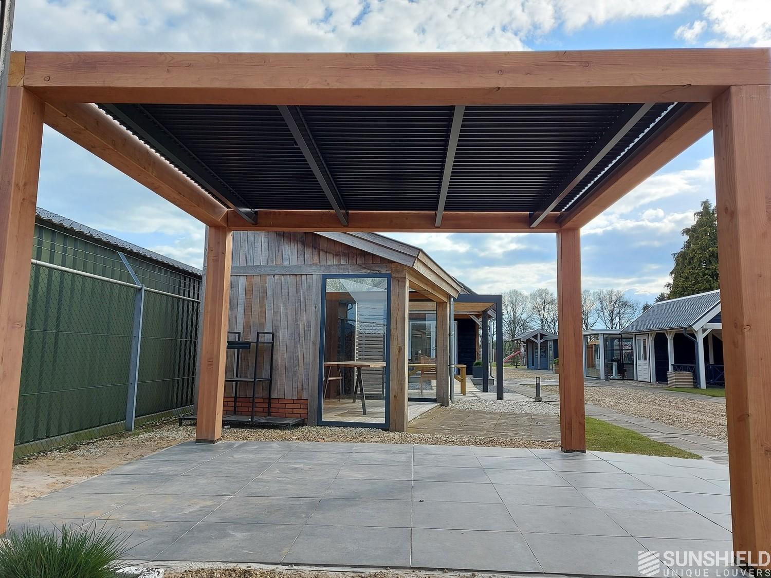 Atlantis - Sfeervol Buitenleven, NL Vianen NB April 2021, Sunshield is launching a new product: SUNSHIELD ATLANTIS Louver Roof. A fantastic combination of traditional and modern style. Aluminium louvers integrated in a natural wood structure.