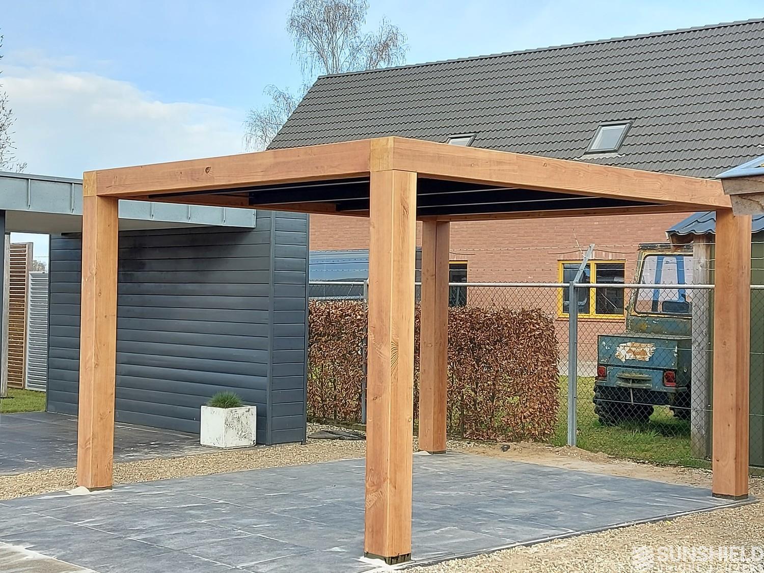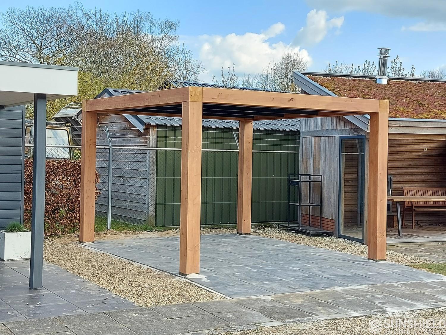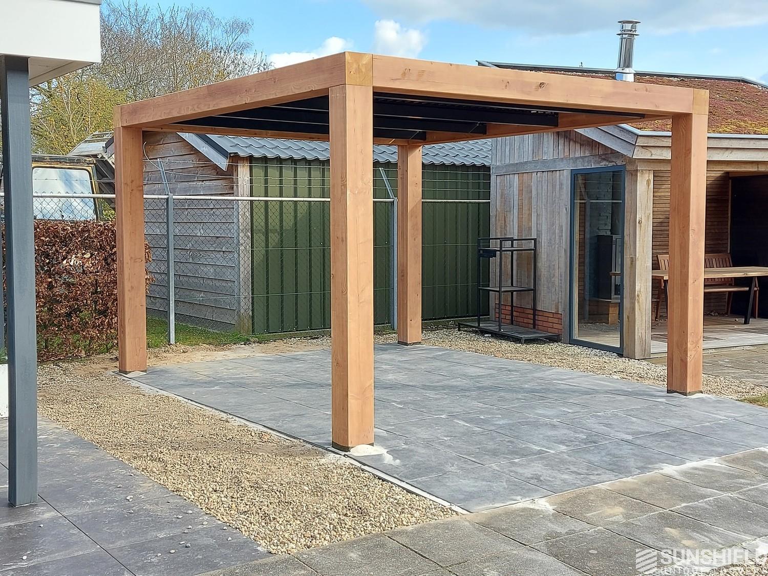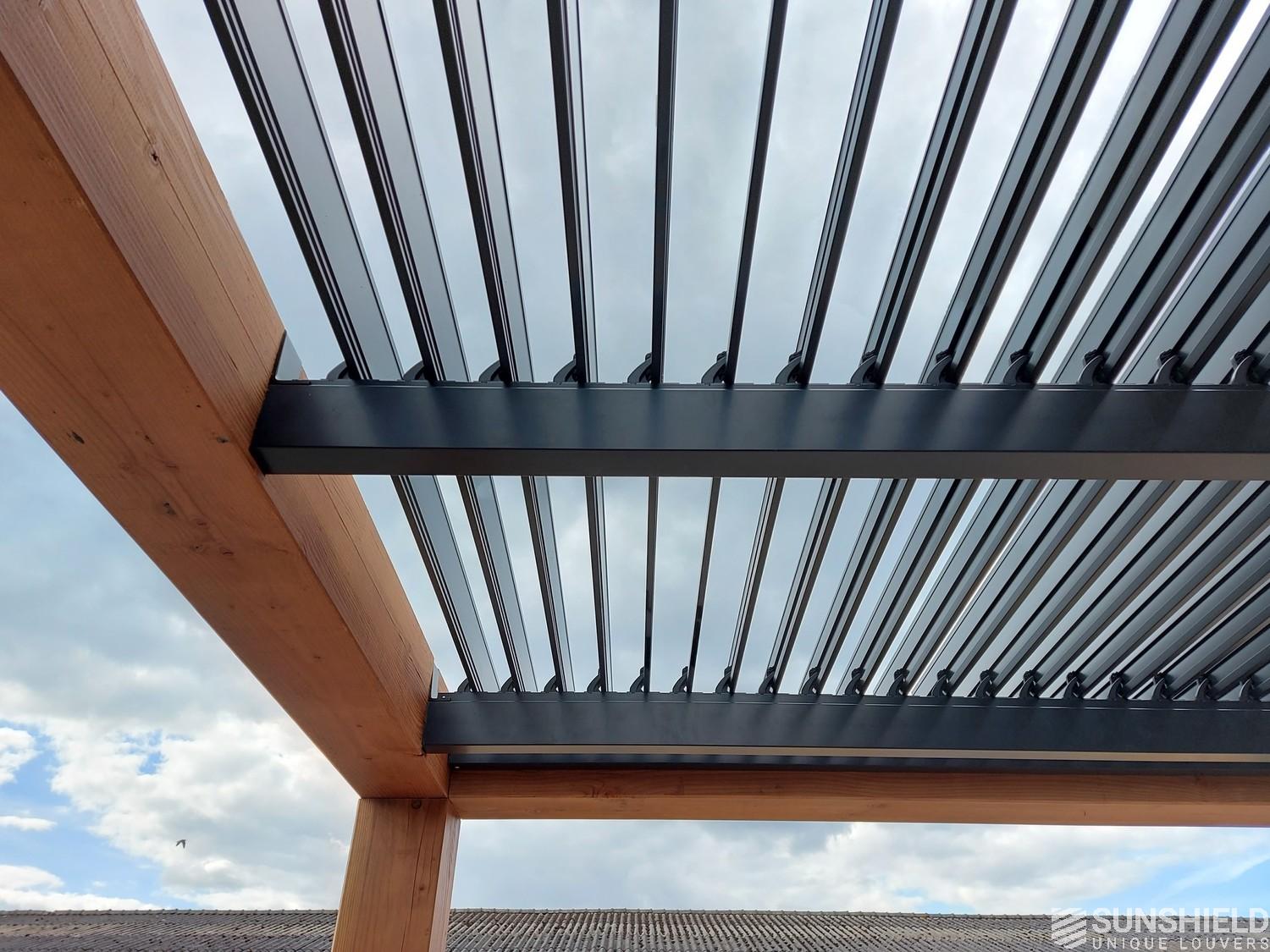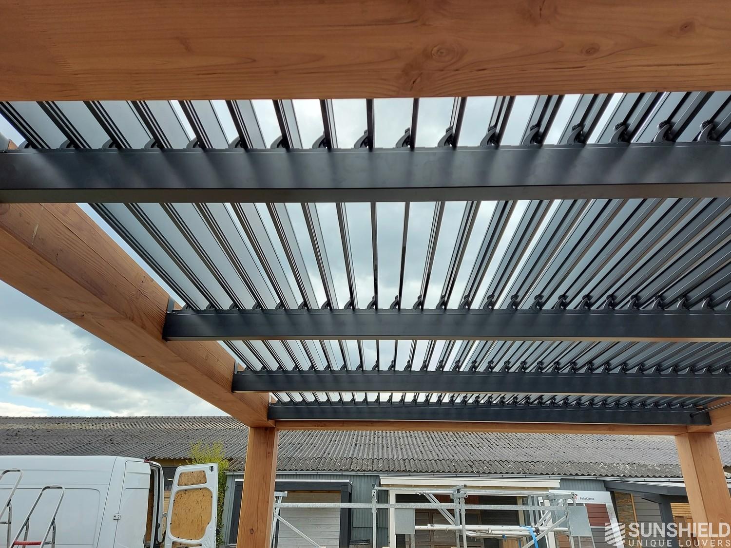 Atlantis - Sfeervol Buitenleven, NL Vianen NB April 2021, Sunshield is launching a new product: SUNSHIELD ATLANTIS Louver Roof. A fantastic combination of traditional and modern style. Aluminium louvers integrated in a natural wood structure.