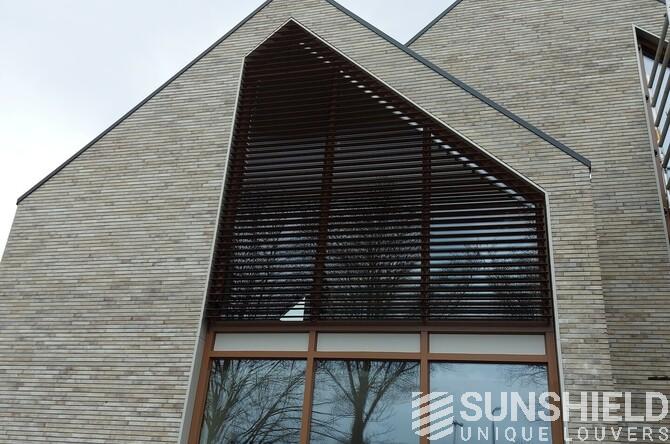 The windows regarding are all of different shapes and sizes; two rectangles, two trapezia, and even a pentagon. The windows in question are all of different shapes and sizes; two rectangles, two trapezoids and even a pentagon. This is a good example that Sunshield supplies movable slats regardless of shape.